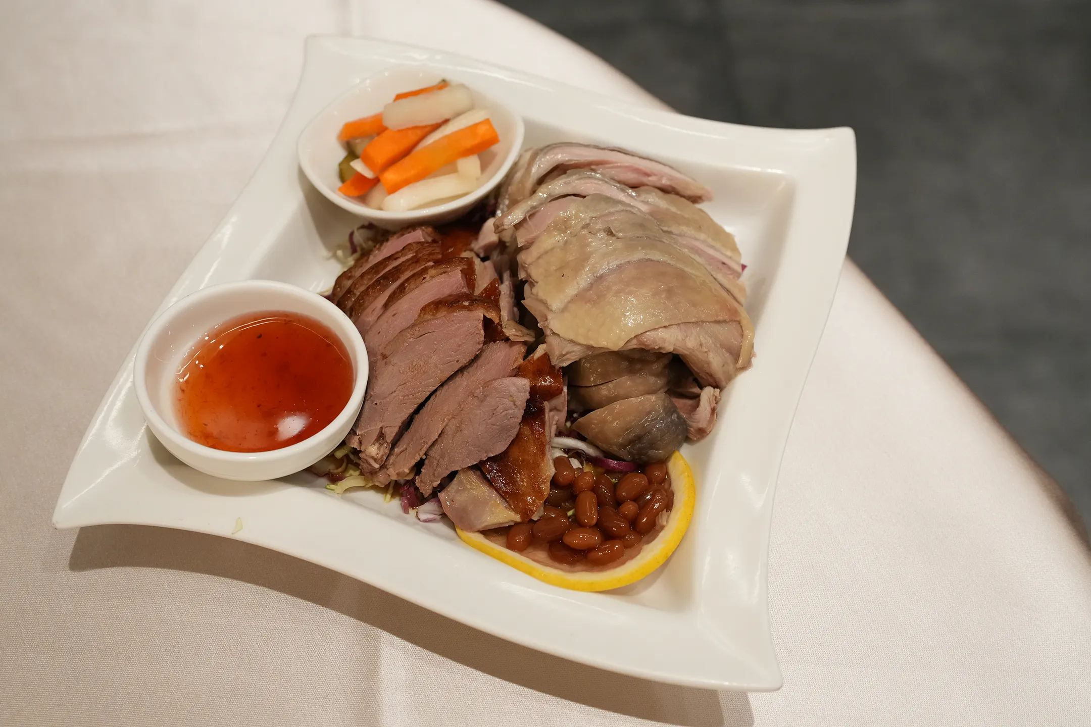 ▼「燒臘雙拼」有招牌玫瑰油雞與櫻桃鴨。玫瑰油雞表現不錯,雞肉保有一定的滑嫩感,油潤適中,入口好吃。再來是烤櫻桃鴨又是店內人氣菜色,鴨肉看起來色澤油潤,但實際吃起來較為乾柴,缺乏應有的油脂香氣與嫩度,是此道菜中唯一稍嫌不足之處。