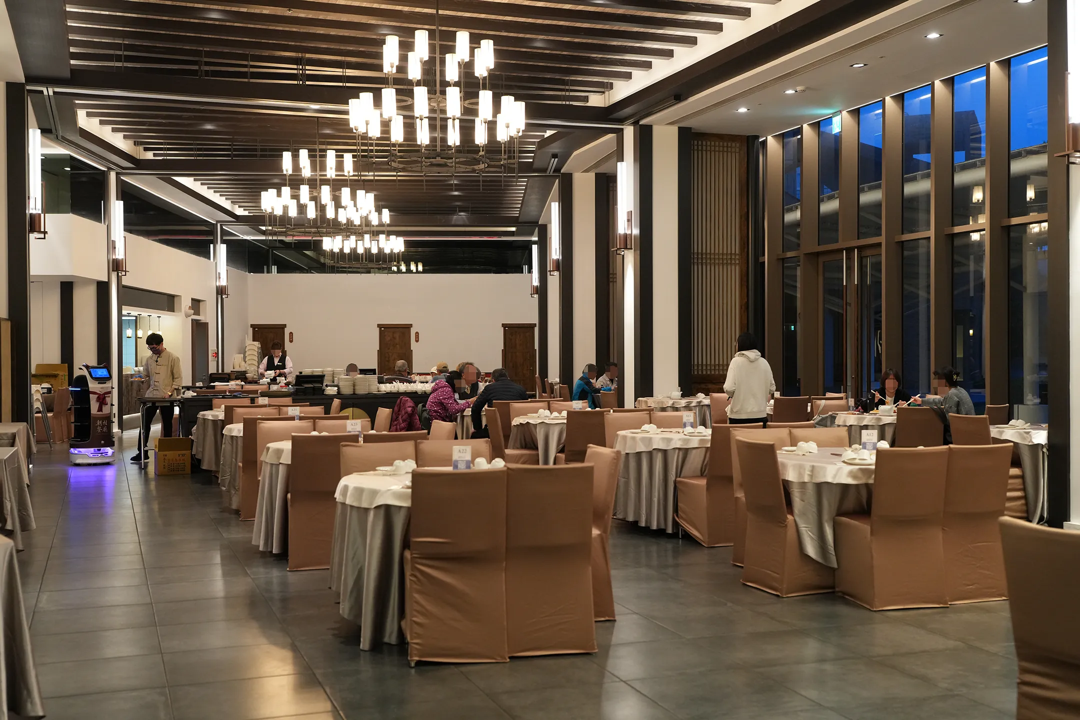 ▼餐廳空間寬敞氣派,天花板採深色木格柵設計,搭配多組造型吊燈垂掛其間,營造出典雅而不失溫馨的用餐氛圍。廳內擺放多張圓桌,桌上鋪有白色桌巾,椅子統一套上香檳金色椅套,整齊劃一。大面落地玻璃窗,採光相當充足,傍晚時也可以感受到夜色慢慢的降臨。