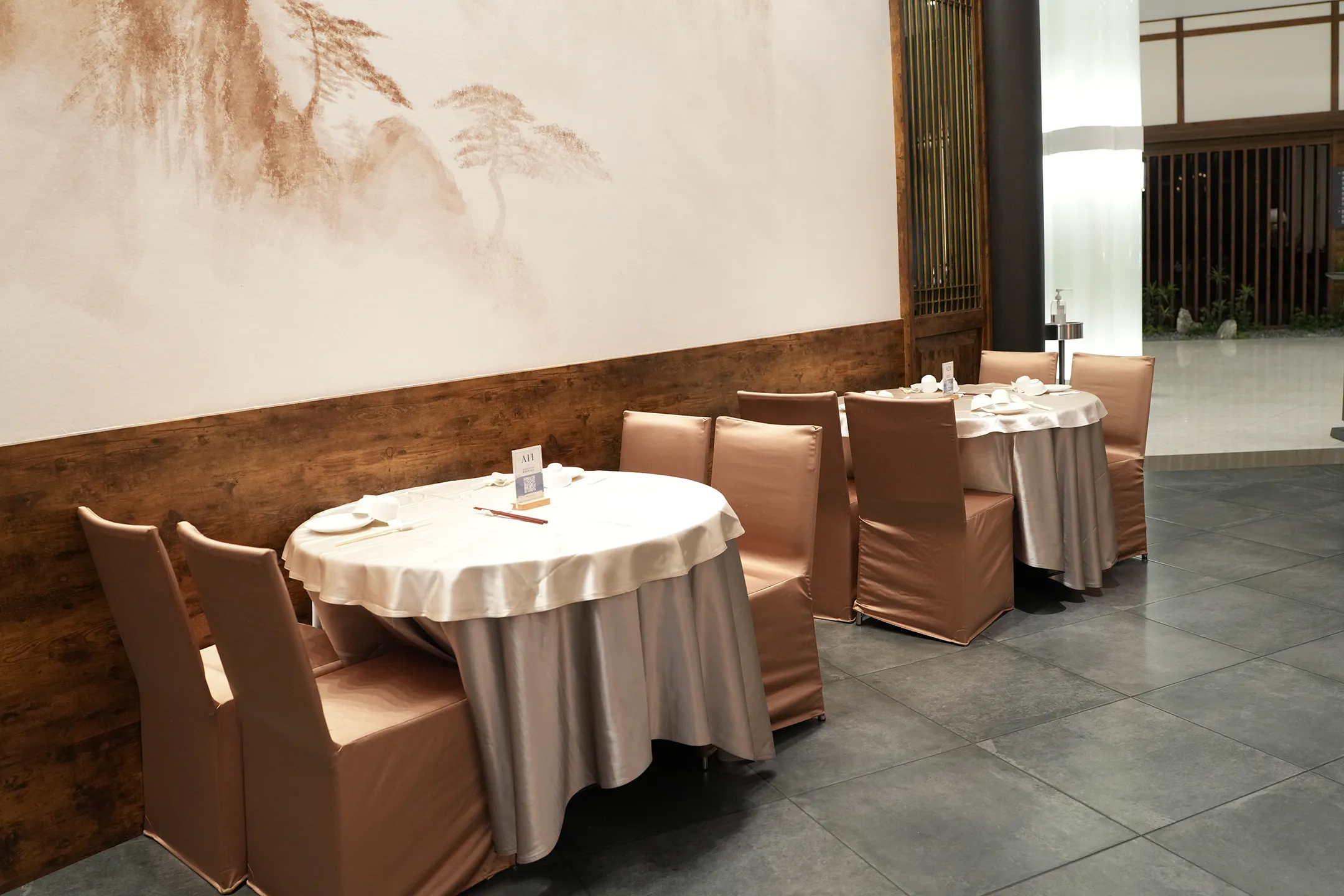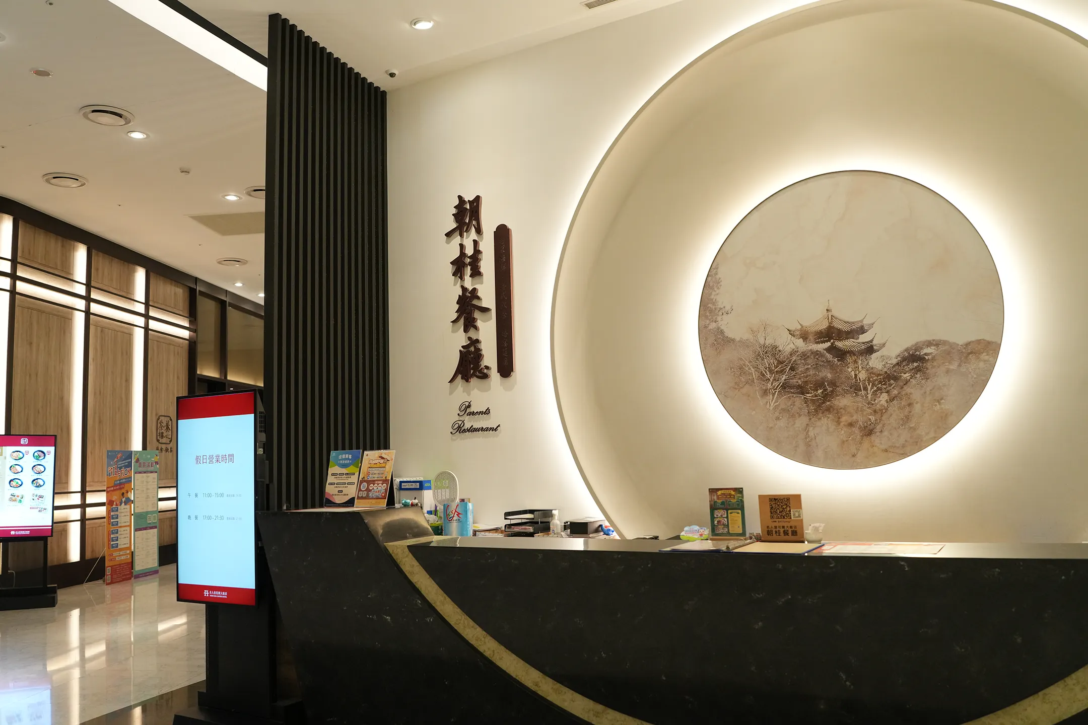 ▼迎面而來的是一座弧形的深色大理石接待櫃檯,典雅而大器。櫃檯後方的主牆嵌有一個圓形發光裝飾框,框內呈現一幅水墨風格的山水畫,畫中古典樓閣隱於山林之間,充滿東方美學韻味。旁邊可見深色格柵隔屏,區隔出用餐區的入口,搭配木紋格窗與明亮的筒燈,整體空間呈現出現代中式風格,兼具質感與溫度。