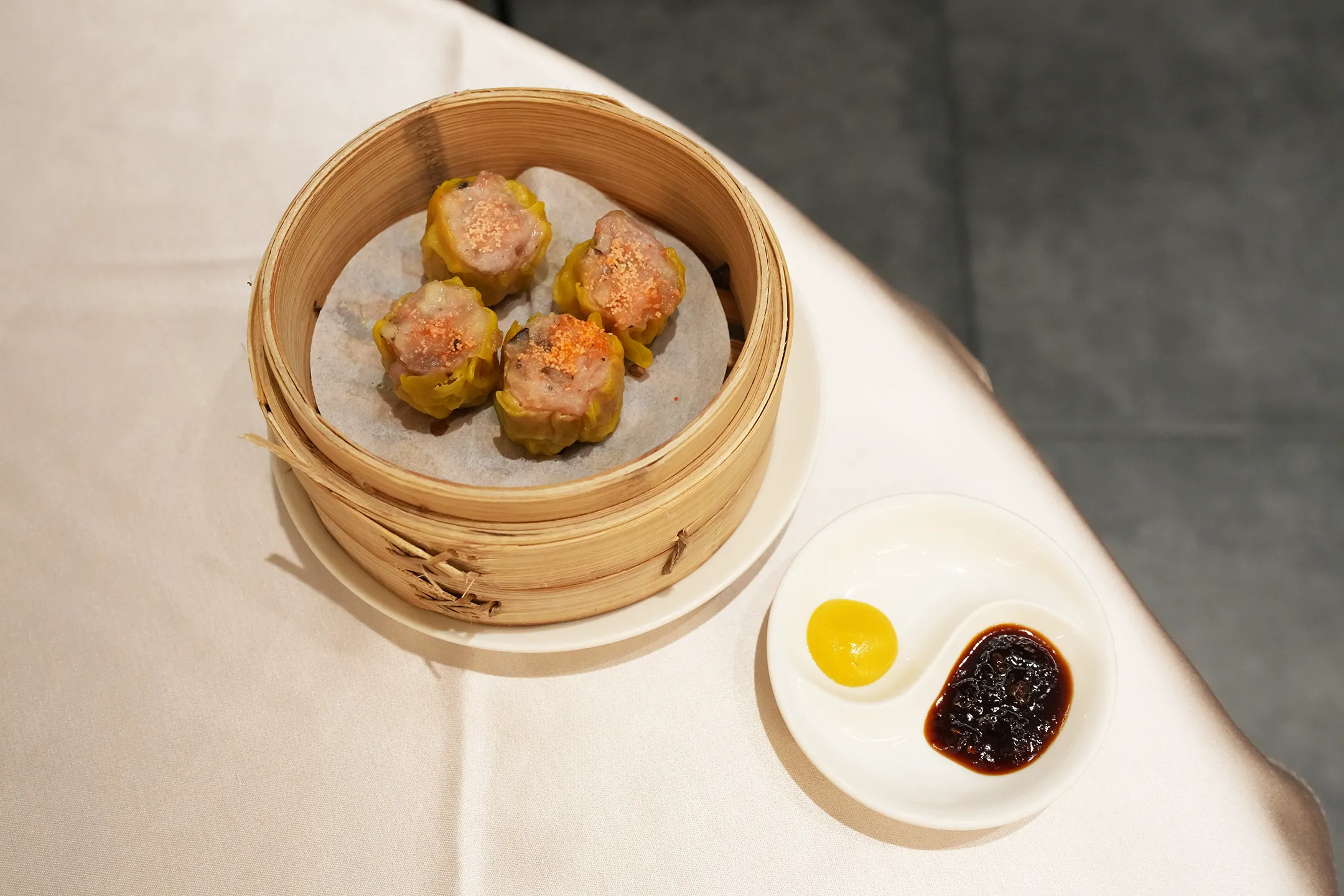 ▼「魚子蒸燒賣」端上桌時賣相尚可,頂部點綴著魚子,看似頗有誠意,然而咬下去的瞬間,口腔裡充滿著肉味,內餡香氣略顯不足,和印象中的蒸燒賣口感相去甚遠,對於熱愛吃港點的我來說,此道料理算為平庸。