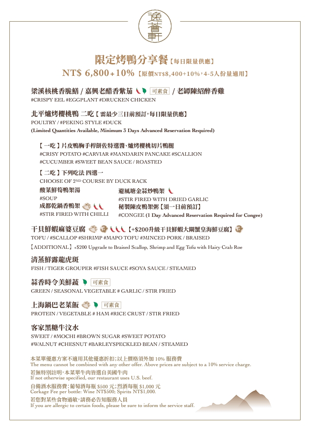 ▼而對烤鴨情有獨鍾的饕客,則可以考慮試試以下的限定烤鴨分享餐,此外,餐廳也會根據季節與特殊節日定期推出其他精選菜色組合,建議大家可以直接到官網查看最新的菜單內容。