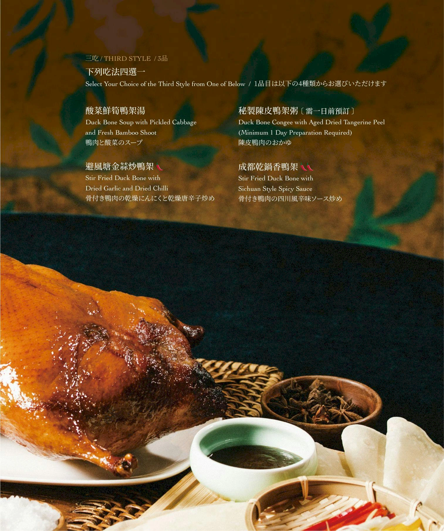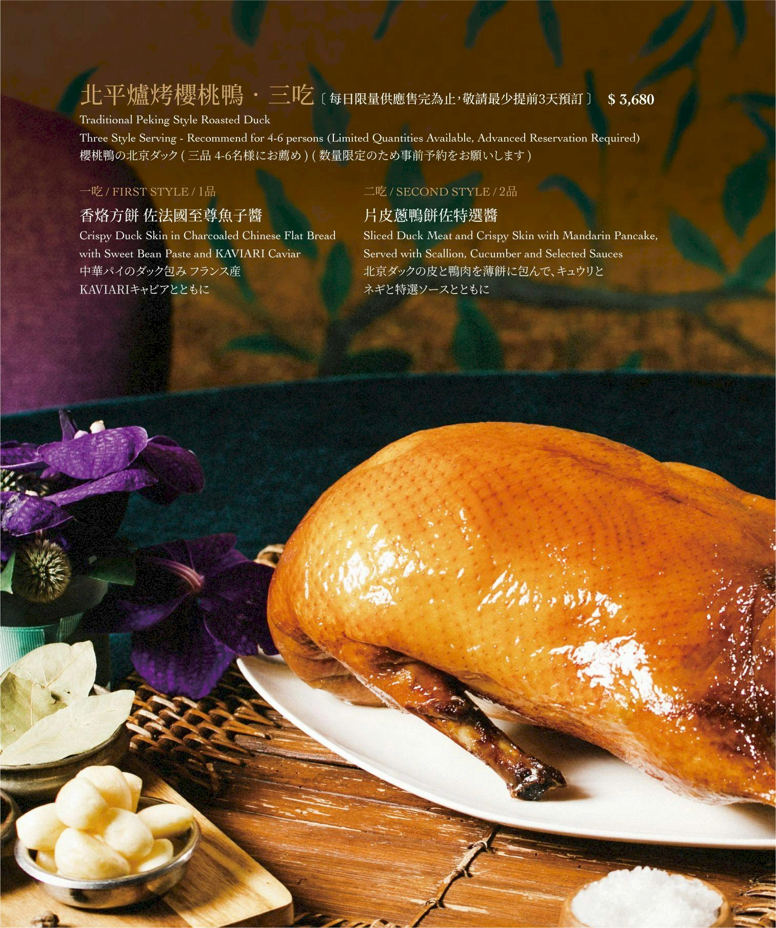 ▼北平爐烤櫻桃鴨三吃為每日限量供應,想品嚐的朋友記得提前三天預訂,前兩吃分別為香烙方餅佐法國至尊魚子醬、片皮蔥鴨餅佐特選醬,第三吃則可從以下四種吃法中擇一: