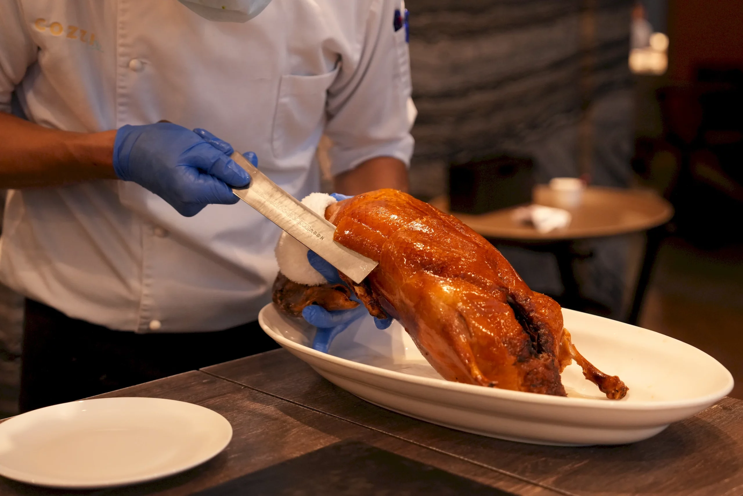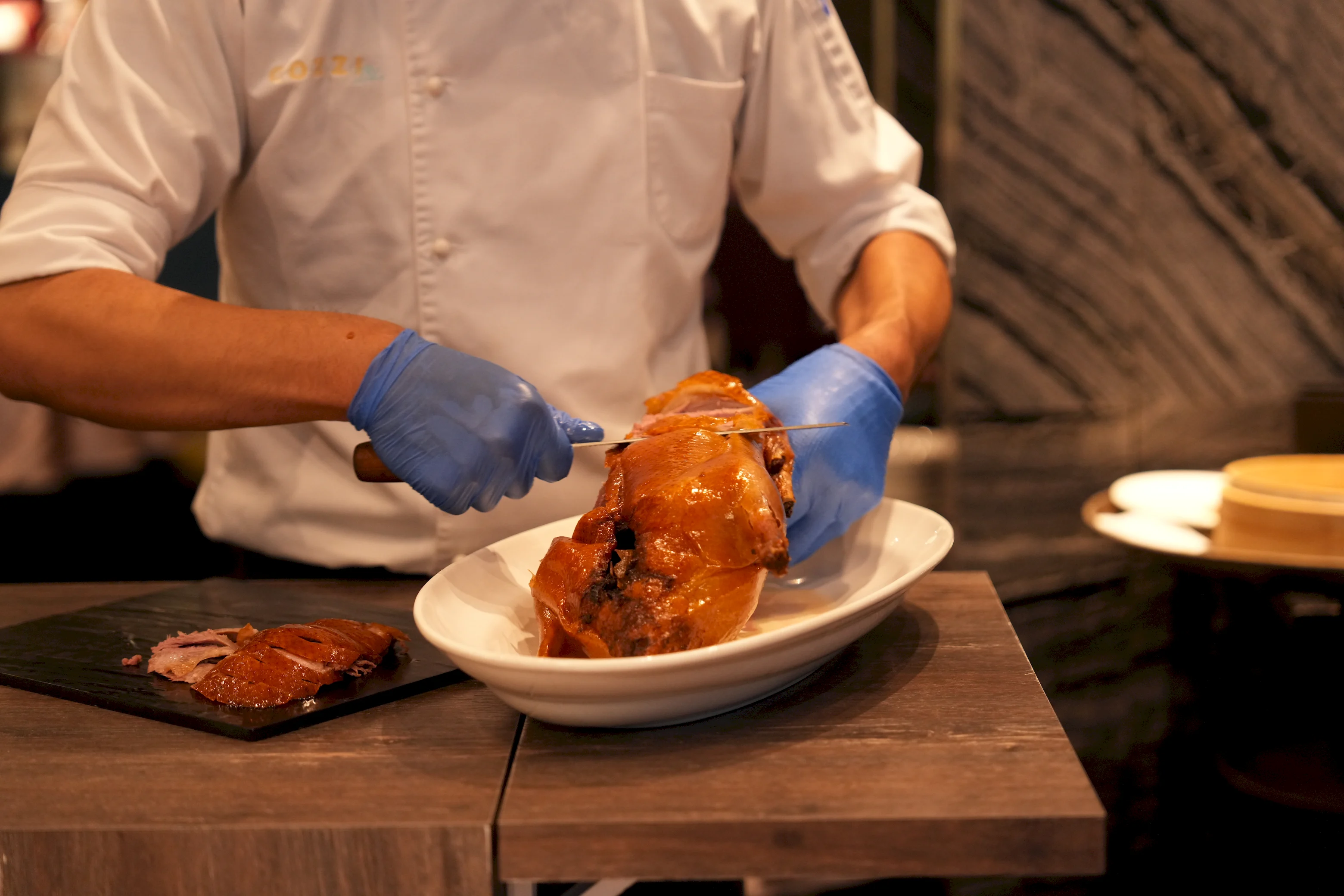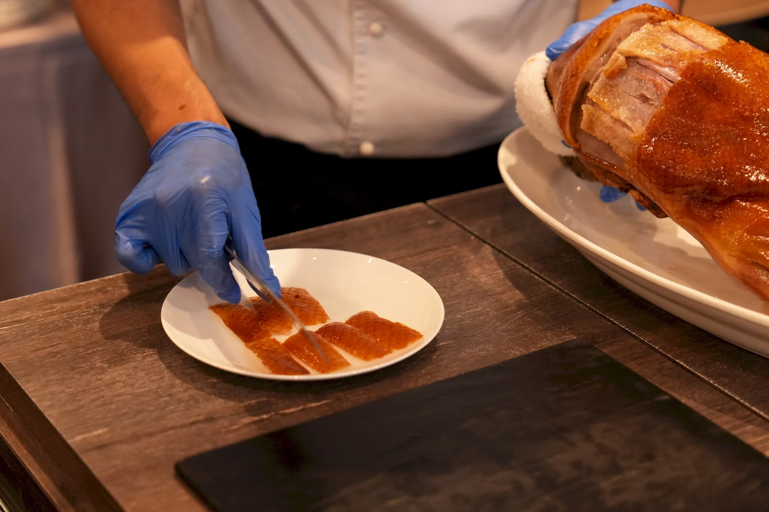 ▼櫻桃鴨上桌時,誘人的香氣立刻在空氣中蔓延開來,讓人忍不住口水直流,接著,師傅會先在桌邊表演片鴨,金黃酥脆的鴨皮在師傅俐落的刀法下,一片片被切了下來。