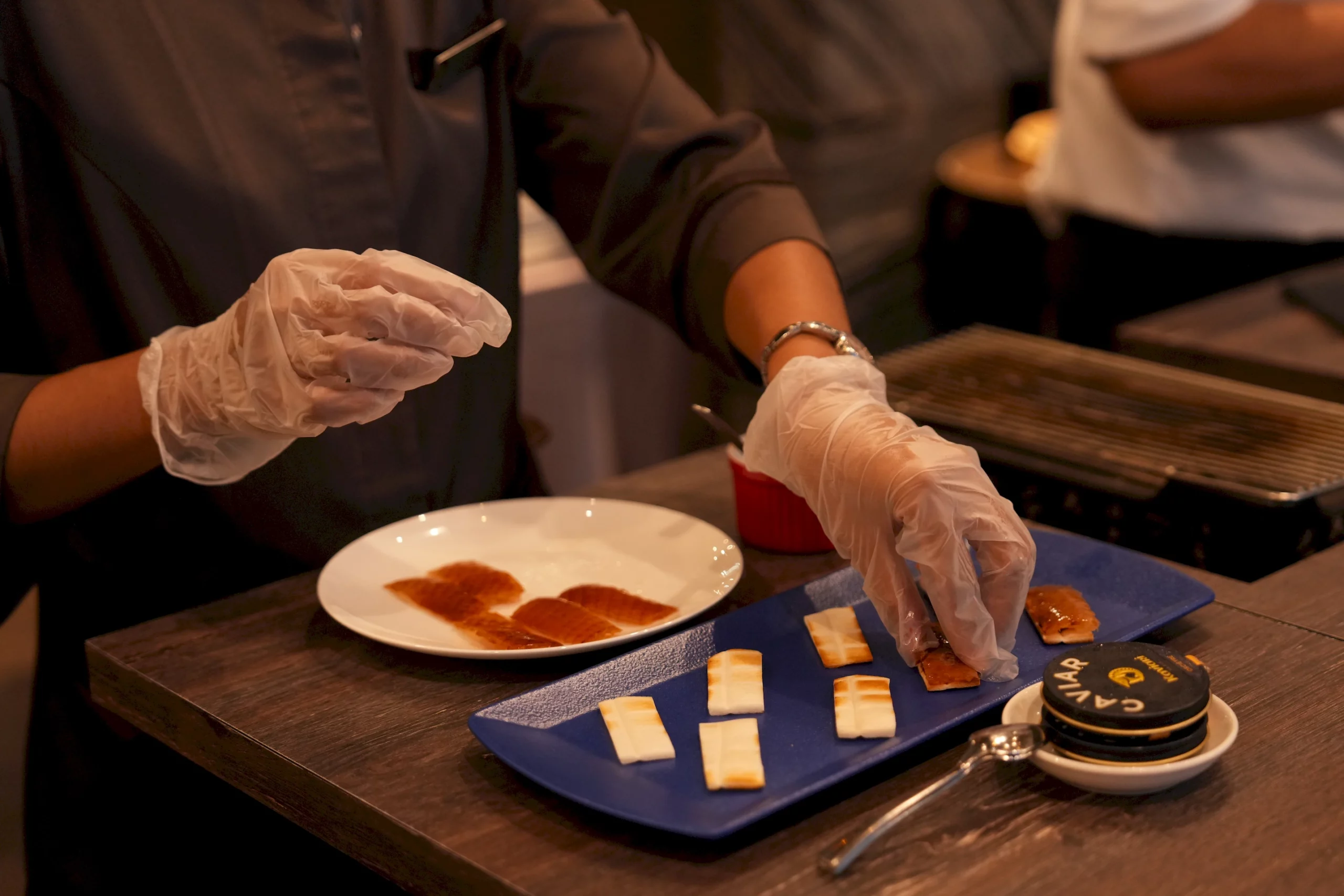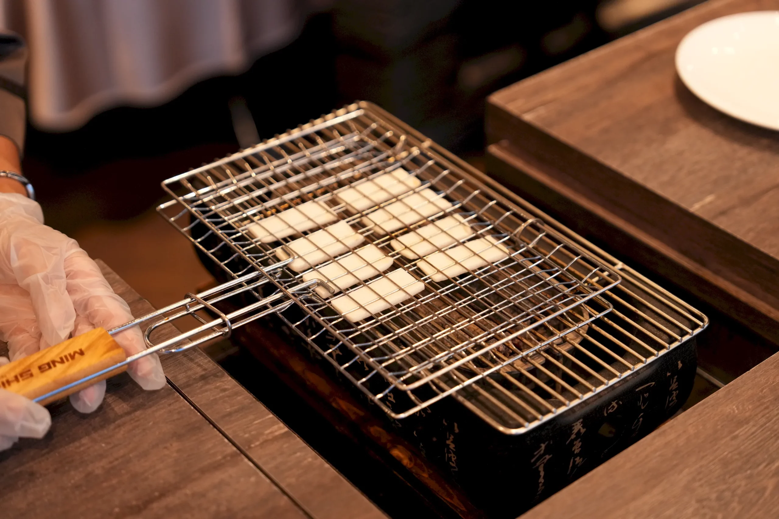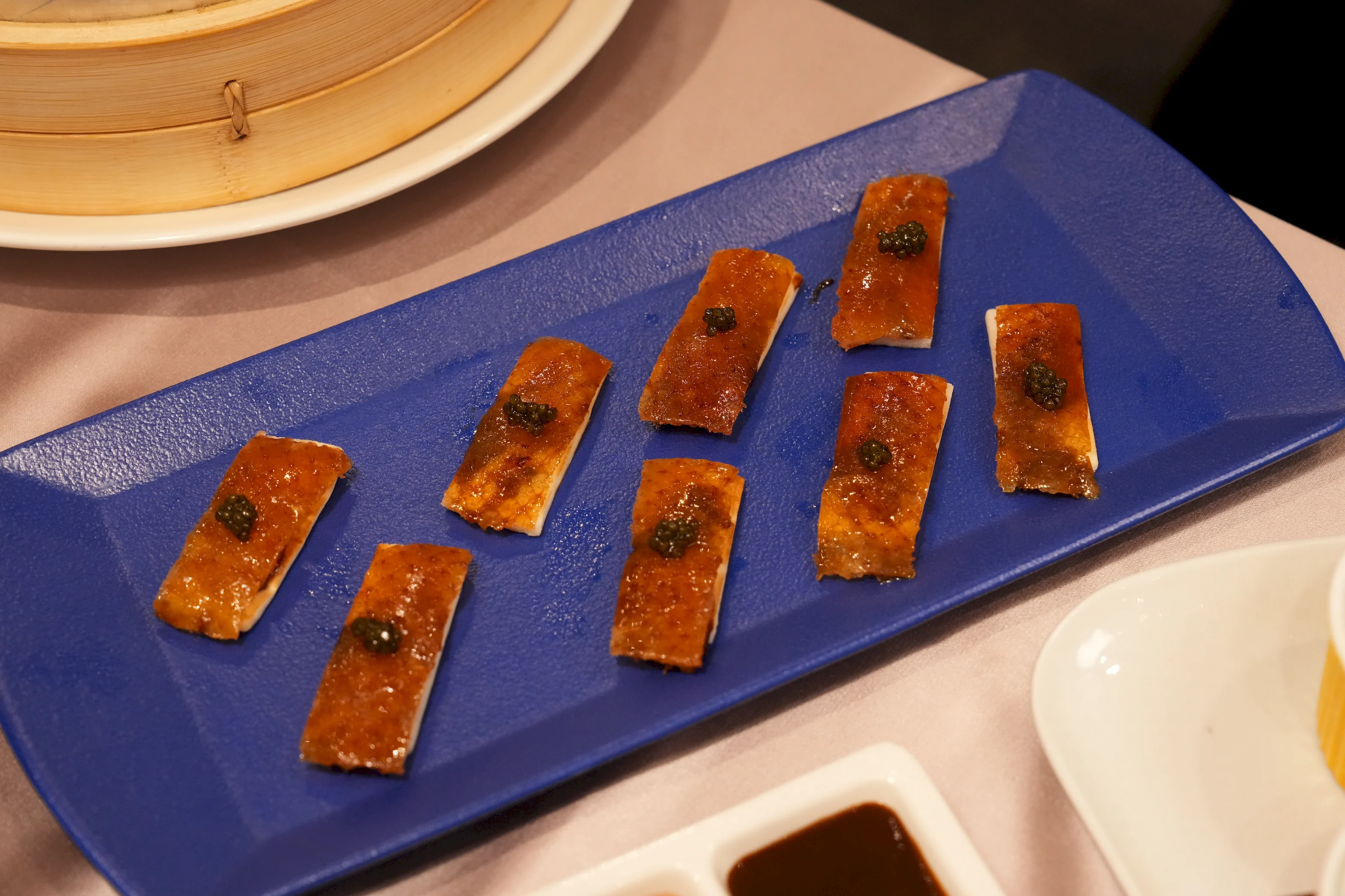 ▼同時,服務人員會在一旁現烤餅皮,並將師傅切下的鴨皮放在餅皮上,最後點綴上魚子醬,一道「香烙方餅佐法國至尊魚子醬」就完成了。