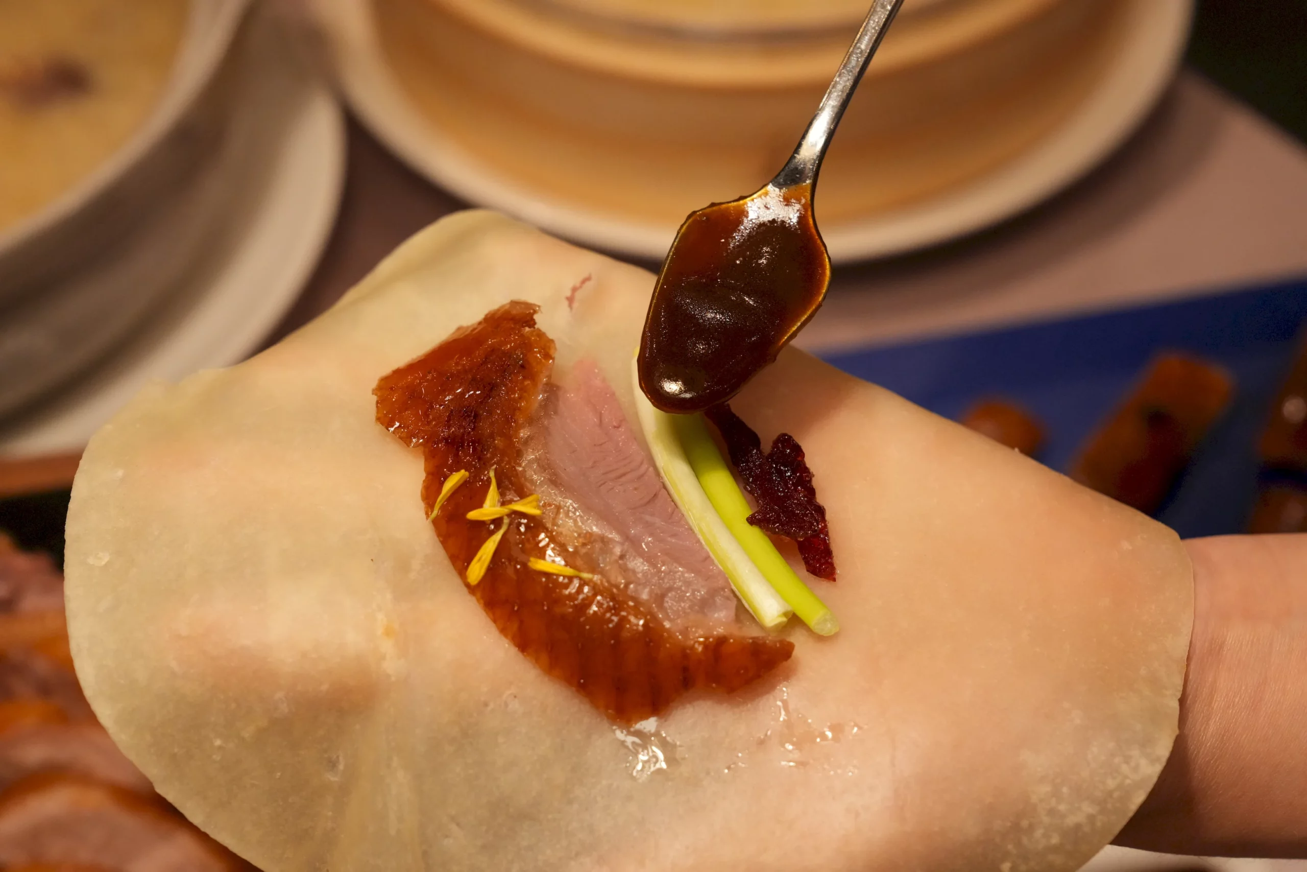▼接下來便可依照個人喜好,選擇單吃或搭配配料享用,鴨肉單吃時帶有煙燻過的香氣,肉質扎實又多汁;若搭配麵皮,其油脂會稍微沾附在餅皮上,讓麵皮吃起來不會太乾,進而帶出麵皮的麵香;喜歡沾醬的朋友,也可以搭配甜麵醬、老梅醬、冰梅醬等特選醬料,增添整體的層次。