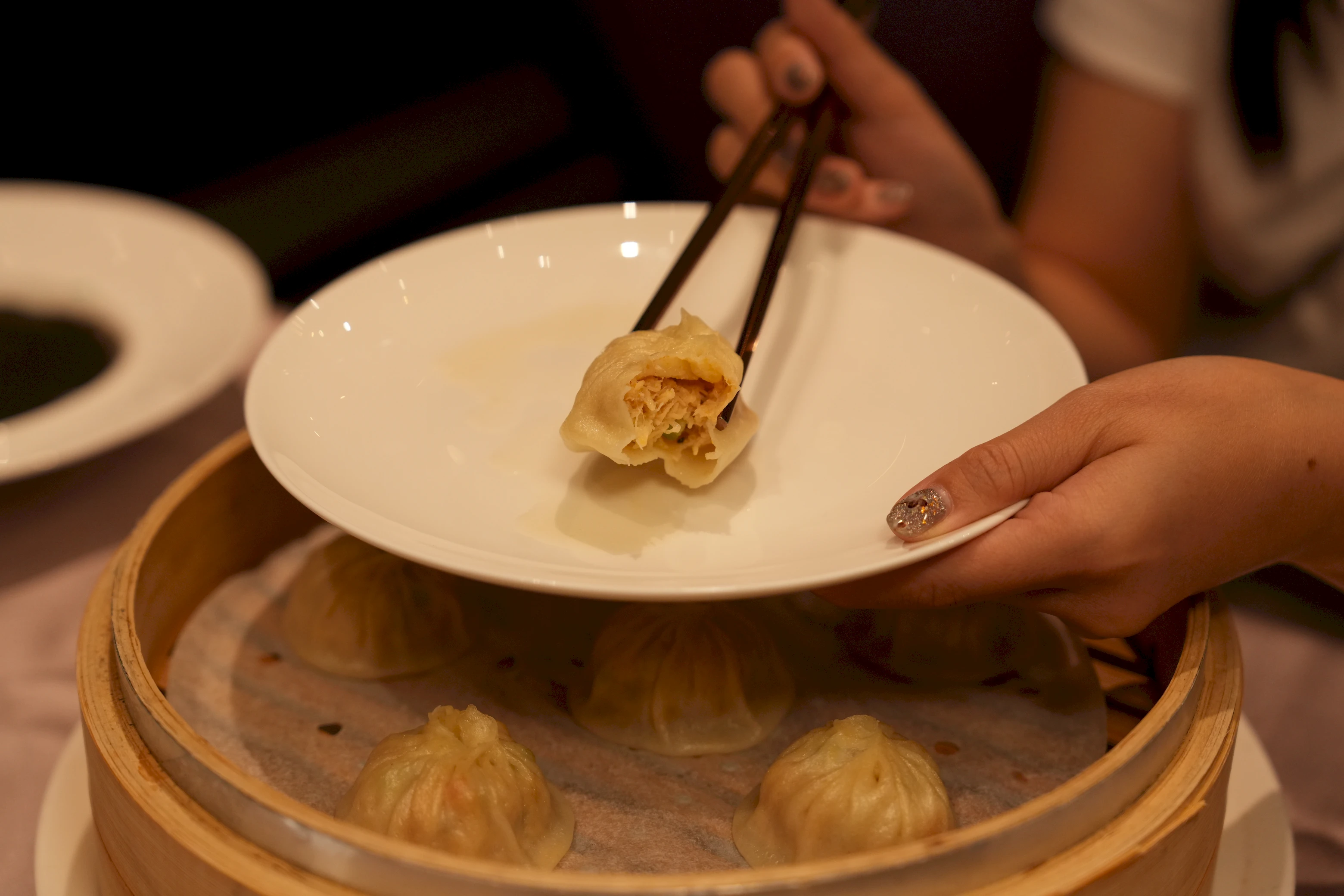 ▼「絲瓜蟹粉湯包」內餡有蟹肉、絞肉和蝦仁碎,味道清甜,咬下去能感受到蟹肉的細緻口感,不過,相較於北平爐烤櫻桃鴨三吃,湯包的整體表現較為中規中矩,更適合平常喜歡清淡口味的朋友嘗試。