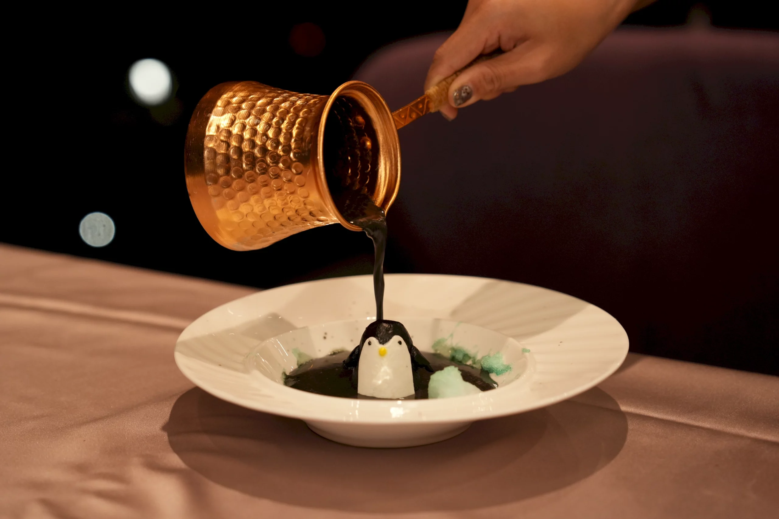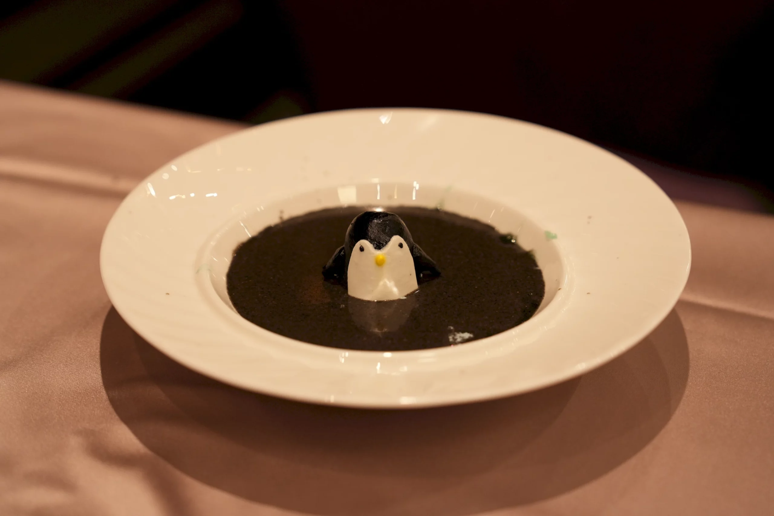 ▼這道甜品上桌時相當可愛,餐廳師傅手工捏的企鵝湯圓坐在棉花糖中,看起來就像正在享受泡泡浴,這時只需拿起一旁的金杯,將香濃的芝麻糊淋在企鵝身上,芝麻糊就會慢慢流到企鵝的身邊,畫面療癒到讓人捨不得吃它。
