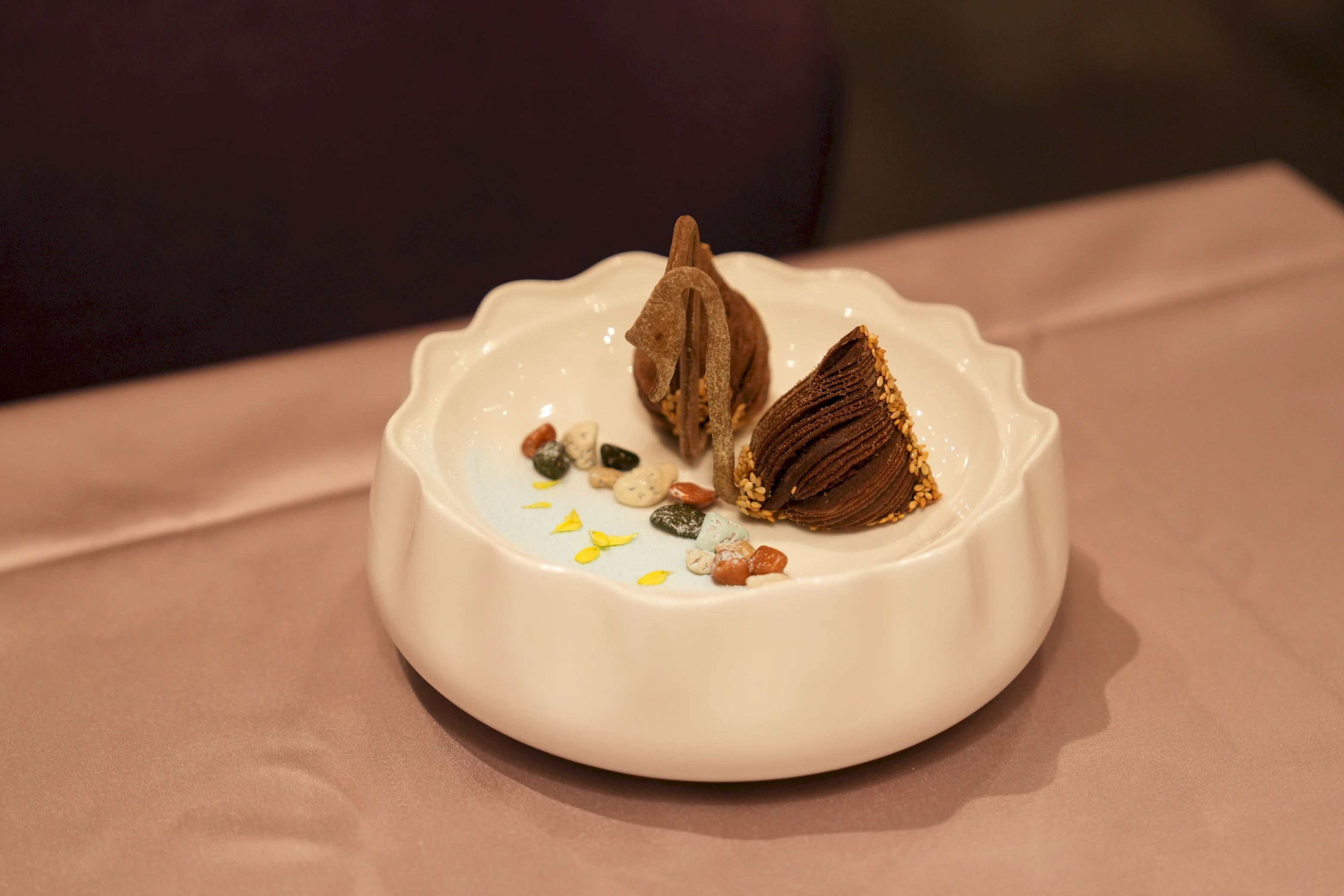 ▼這道天鵝酥外型華麗,雖然旁邊搭配的石頭巧克力稍顯突兀,但仍相當精緻,內餡結合了紅豆泥、金佶、茶粉與松子,入口後金桔的香氣較為突出,甚至稍微有點嗆,使得整體的風味感覺沒有完全融合,對我來說稍微不太習慣這樣的味道😥