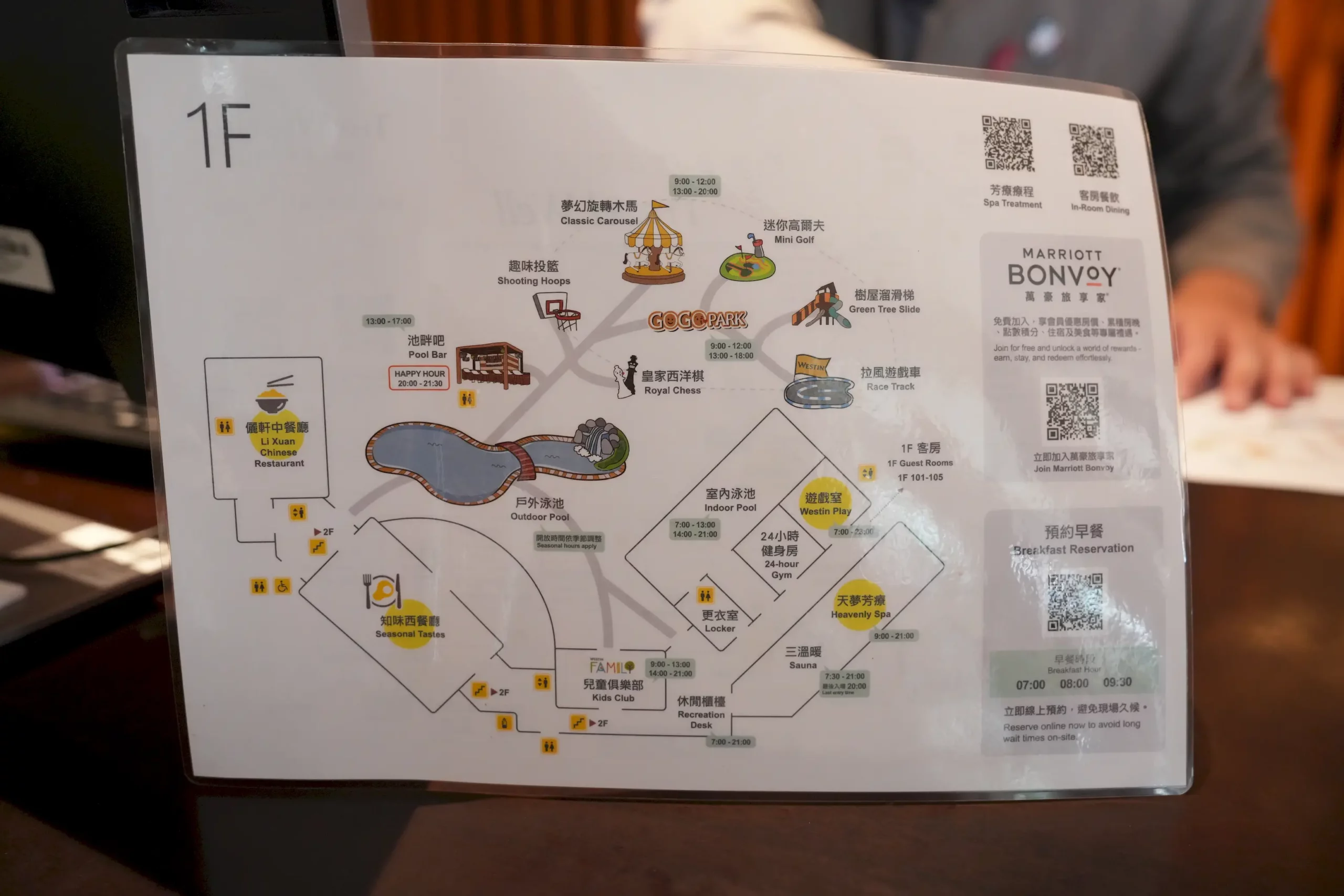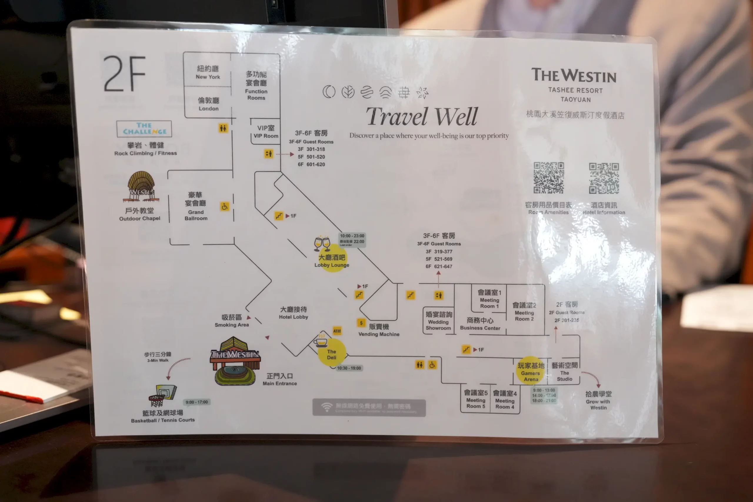 ▼辦理入住時,櫃檯會提供一張飯店的導覽地圖,上面清楚標示著房間的位置與各項設施的開放時間,基本上除了三溫暖與天夢芳療需要另行付費外,其餘設施房客皆可免費使用,值得注意的是,大廳與宴會廳等公共空間位於二樓,而各項休閒設施則分布於一樓,如果要使用設施,記得先留意一下樓層。