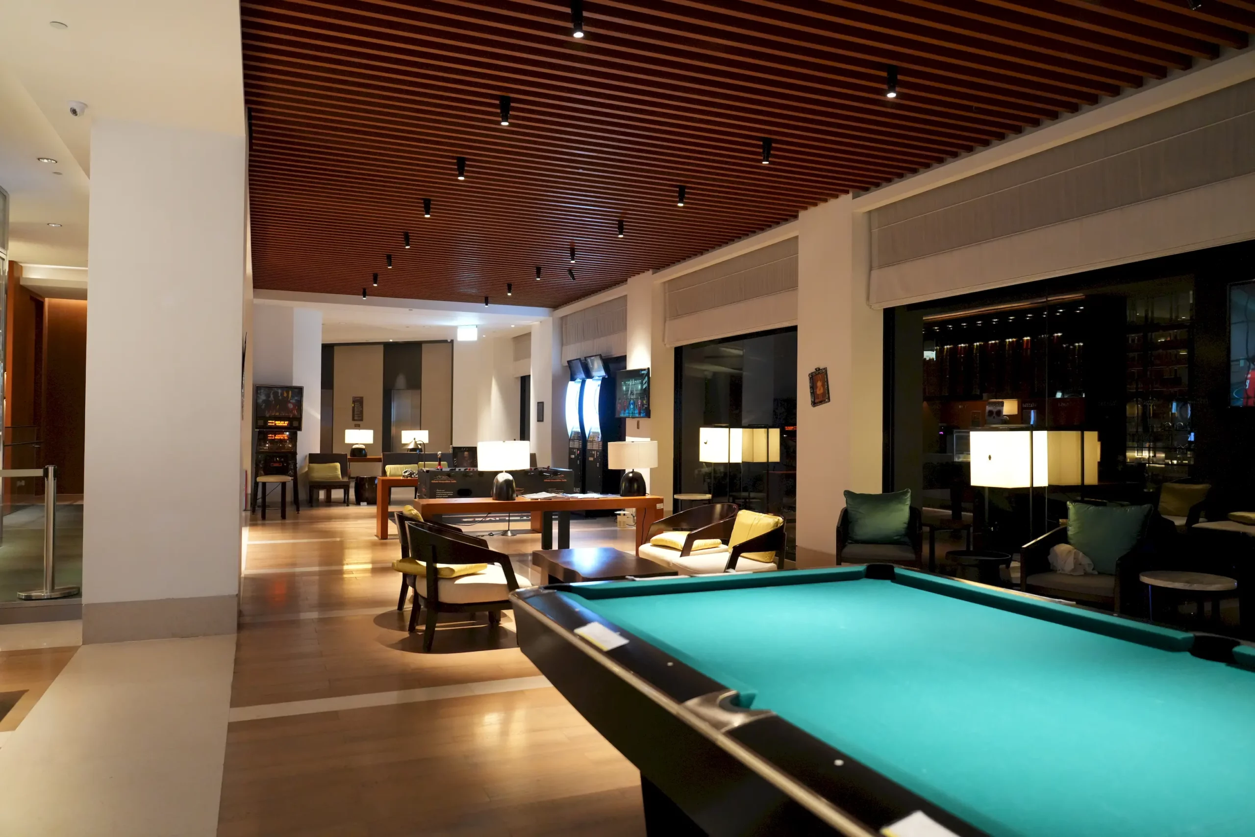 ▼大廳的後方就是寬敞的酒吧區,這裡設有超大型的投影螢幕、撞球桌和飛鏢區,非常適合夜晚和三五好友在此小酌、打一局撞球或投飛鏢;另外,這裡每晚8點半也會安排表演,而Happy Hour 則從晚上9點半一路延續到半夜2點,期間提供紅酒、白酒、氣泡飲等無限暢飲。