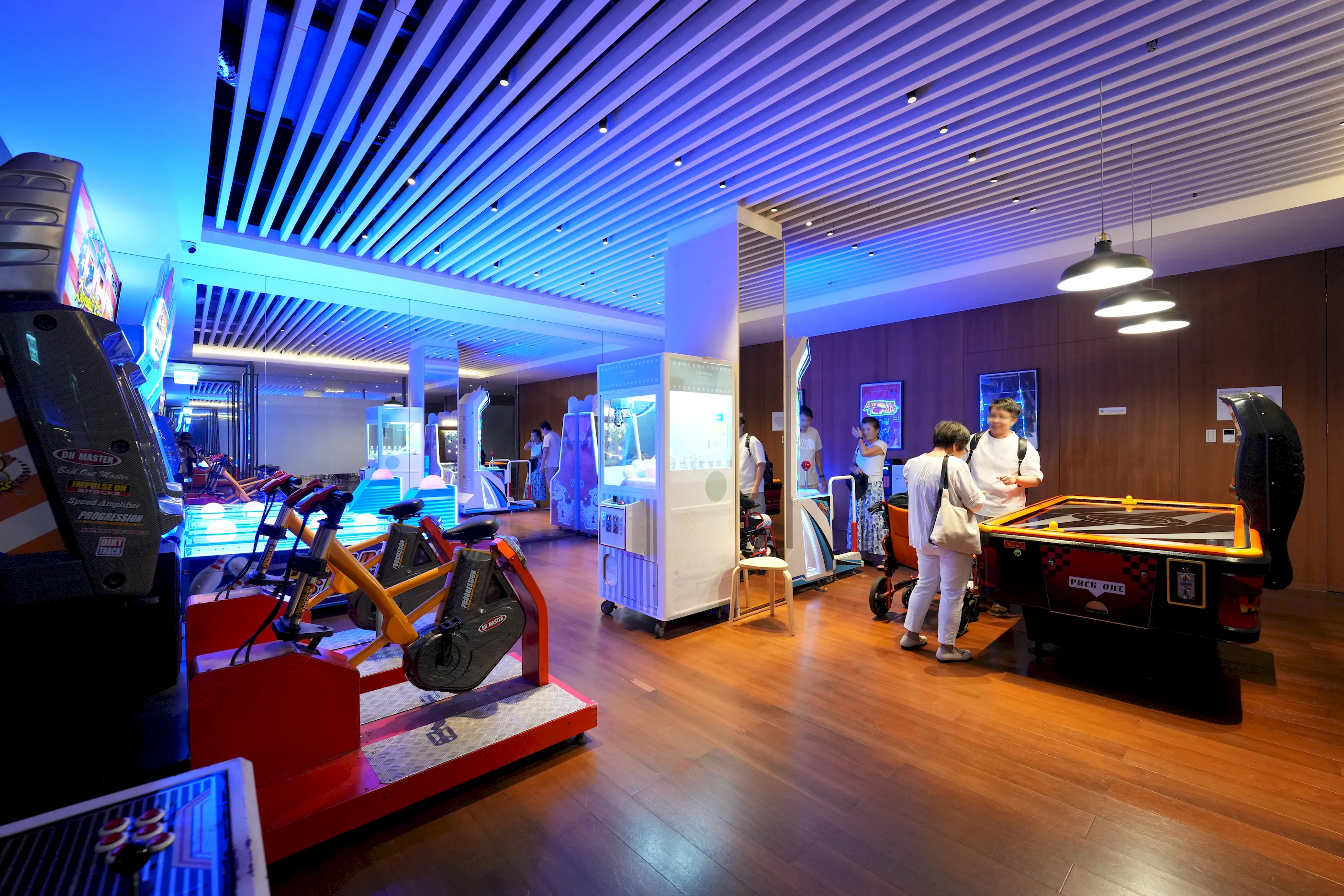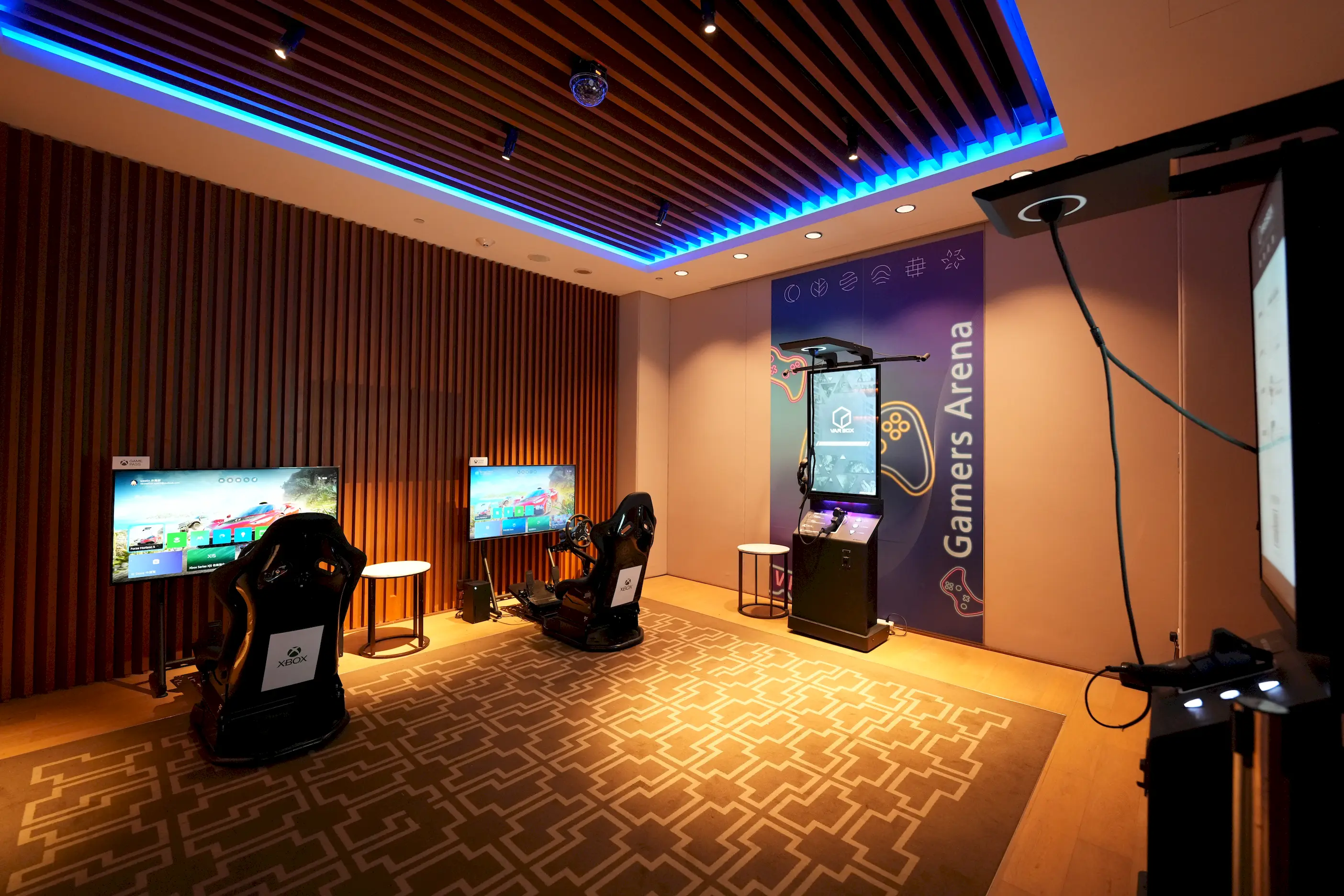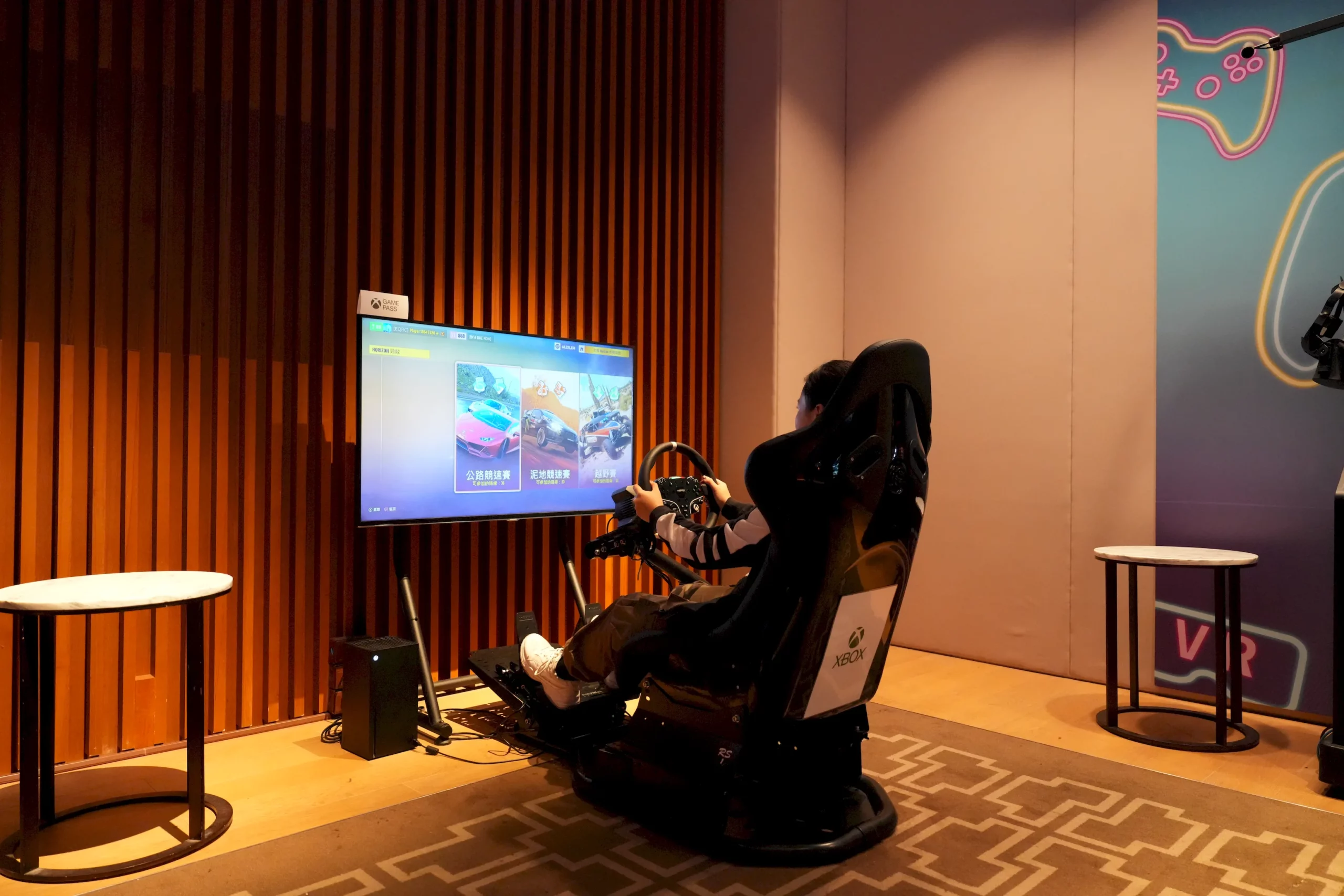 ▼內部共有兩台賽車與VR射擊遊戲裝置,藍紫色的投射燈光讓空間呈現出濃濃的未來感,讓人一走進來就不自覺被吸引。