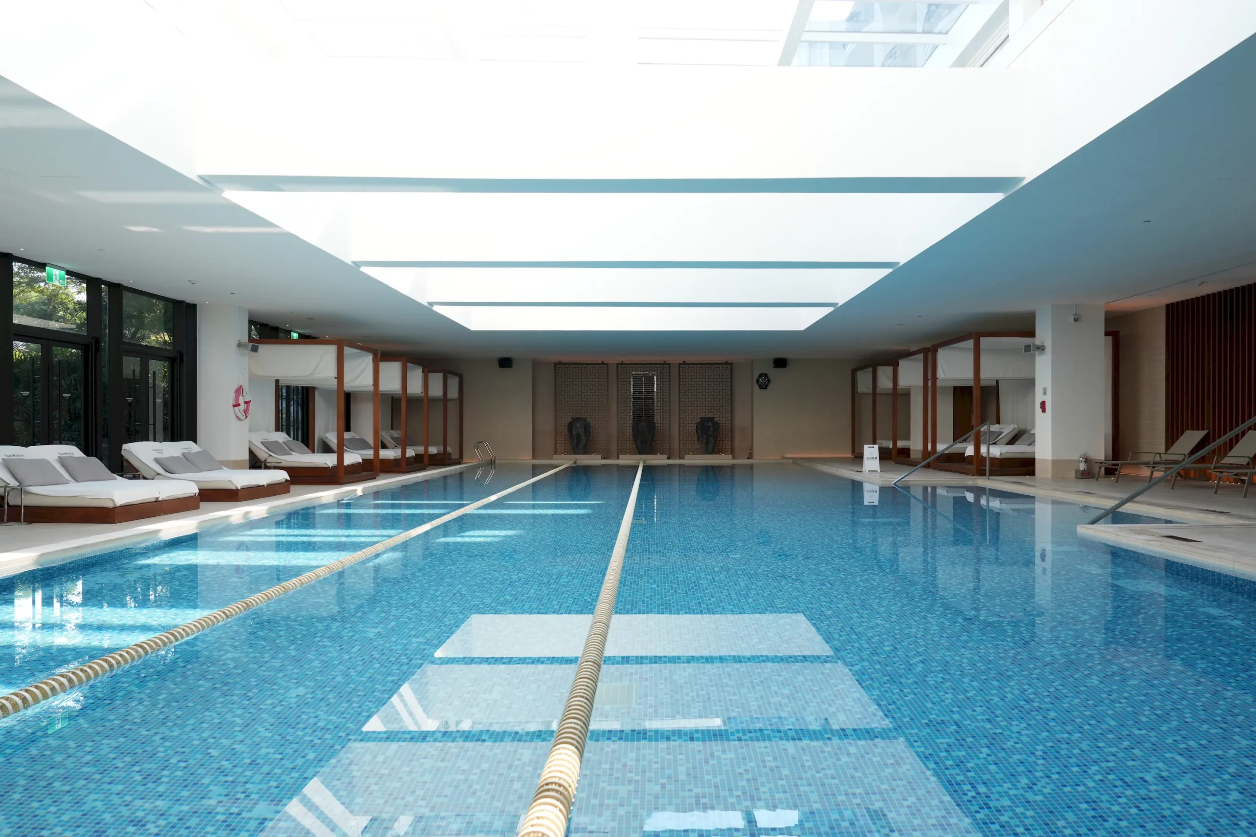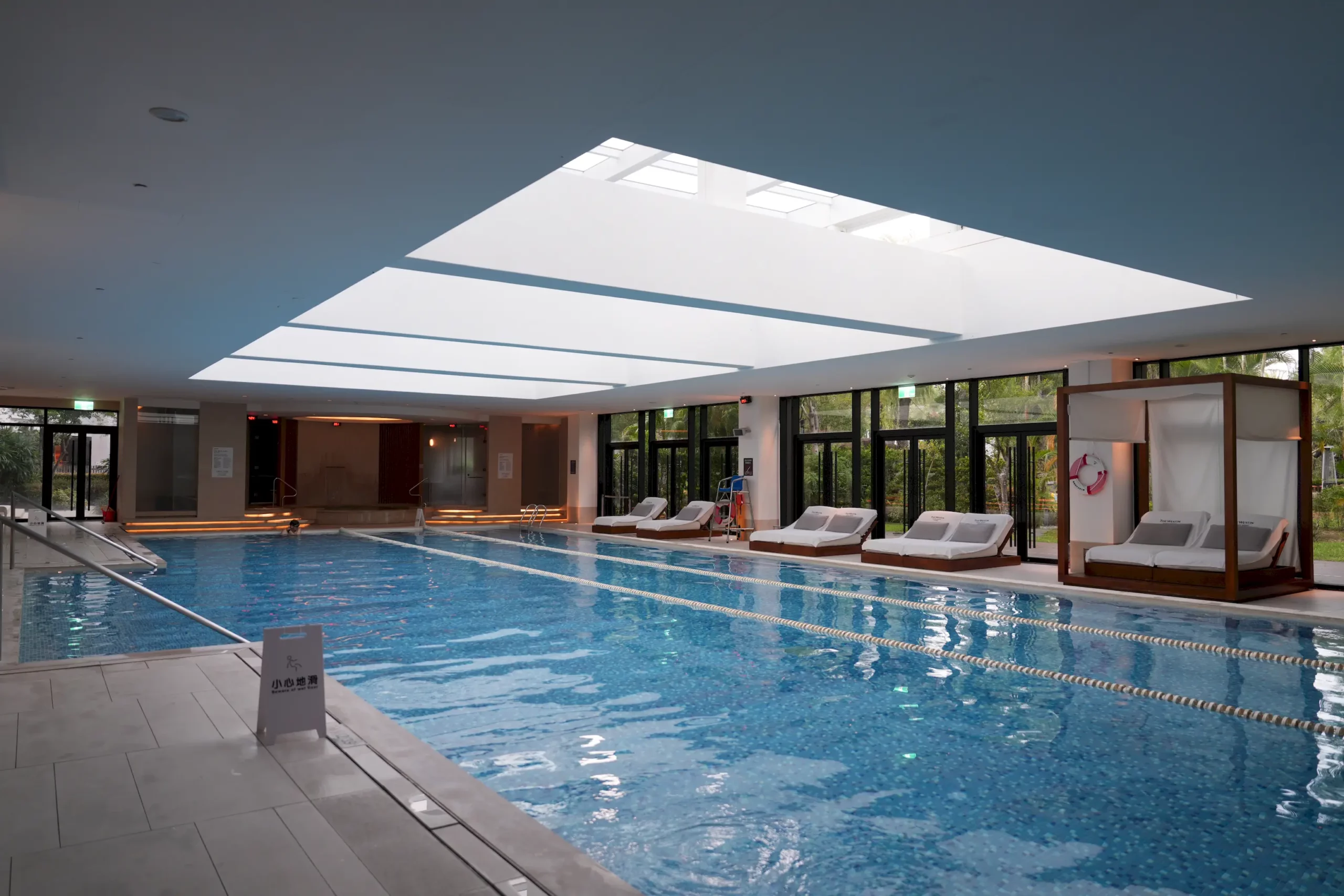 ▼「室內泳池」總長25米,設有恆溫系統,對於怕冷又想下水的人來說非常貼心,泳池上方還有天井,整體採光極佳,池畔旁也有躺椅讓房客可以在游泳之餘好好放鬆,現場也有救生員在場,其他設施像是烤箱、蒸氣室、按摩池也都有,整體設備相當完善,開放時段如下: