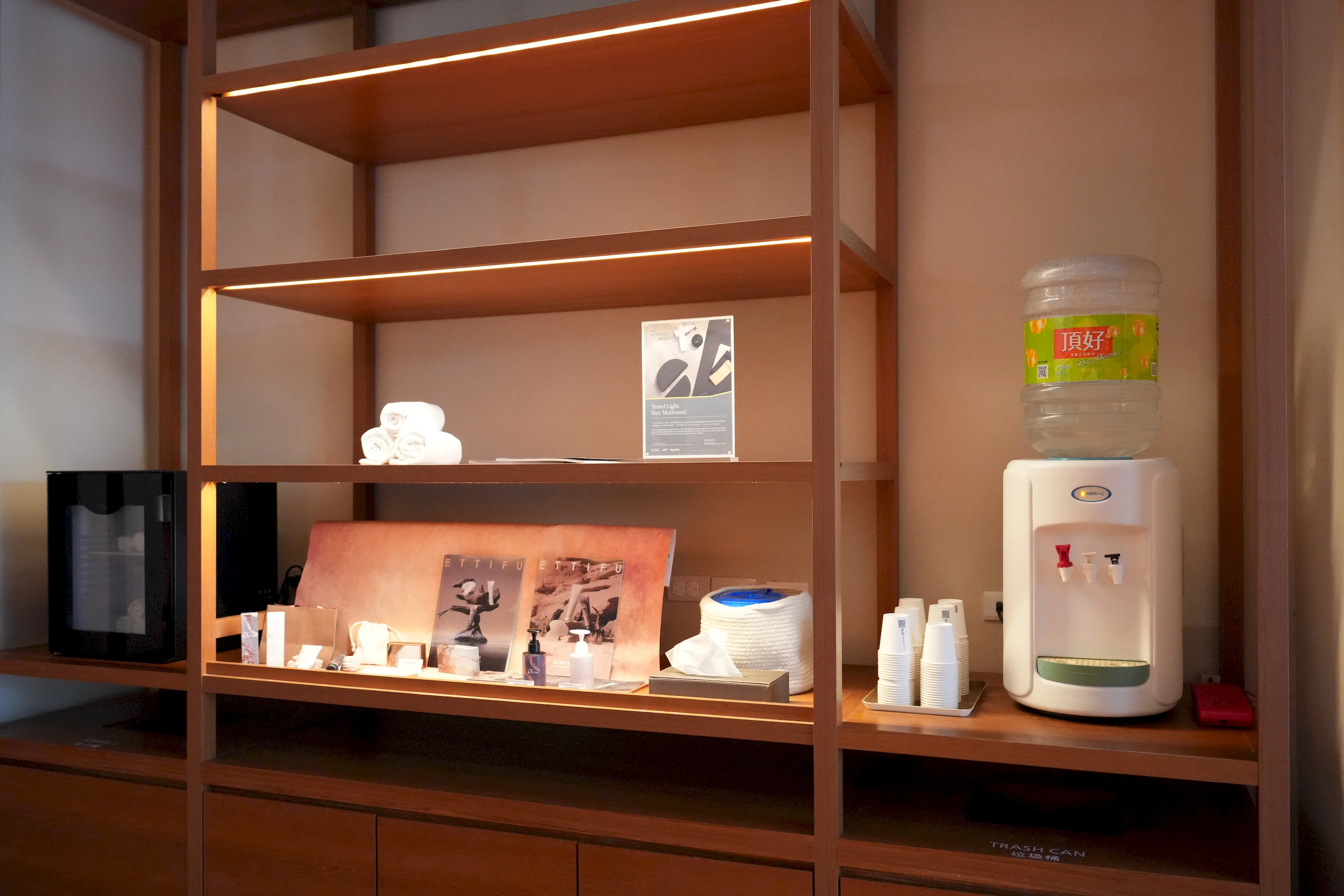 ▼如果口渴,一旁也備有飲水機和紙杯可以取用,但毛巾、洗沐用品等備品就需要額外付費。