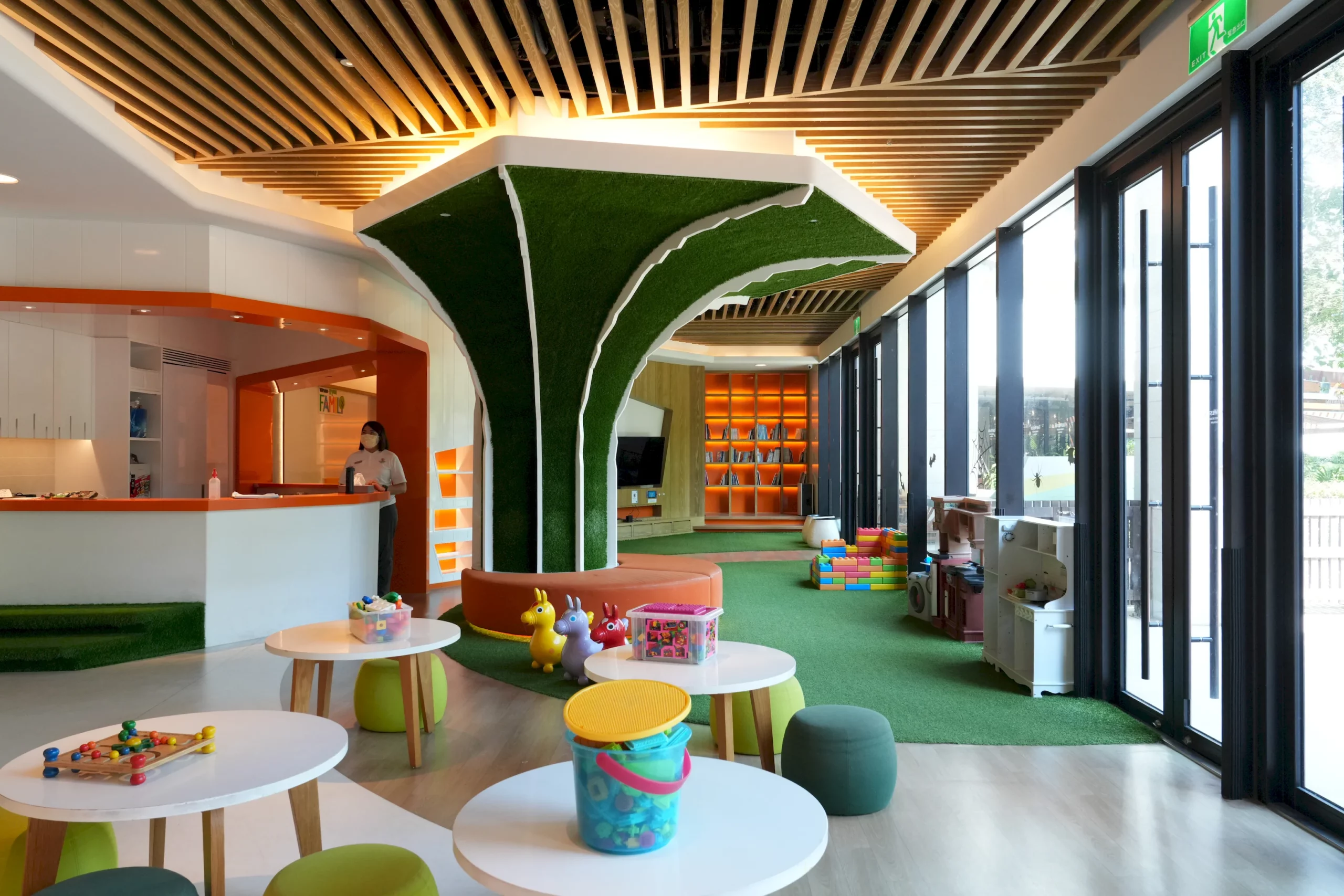 ▼進入內部,服務人員會先協助房客進行手部消毒,接著就能自由探索各個遊戲區域,整體空間以線板和人工草皮打造出可愛的樹屋造型,遊戲則有積木、扮家家酒、益智遊戲等,讓各年齡段的小朋友都能在這裡自在地玩耍。