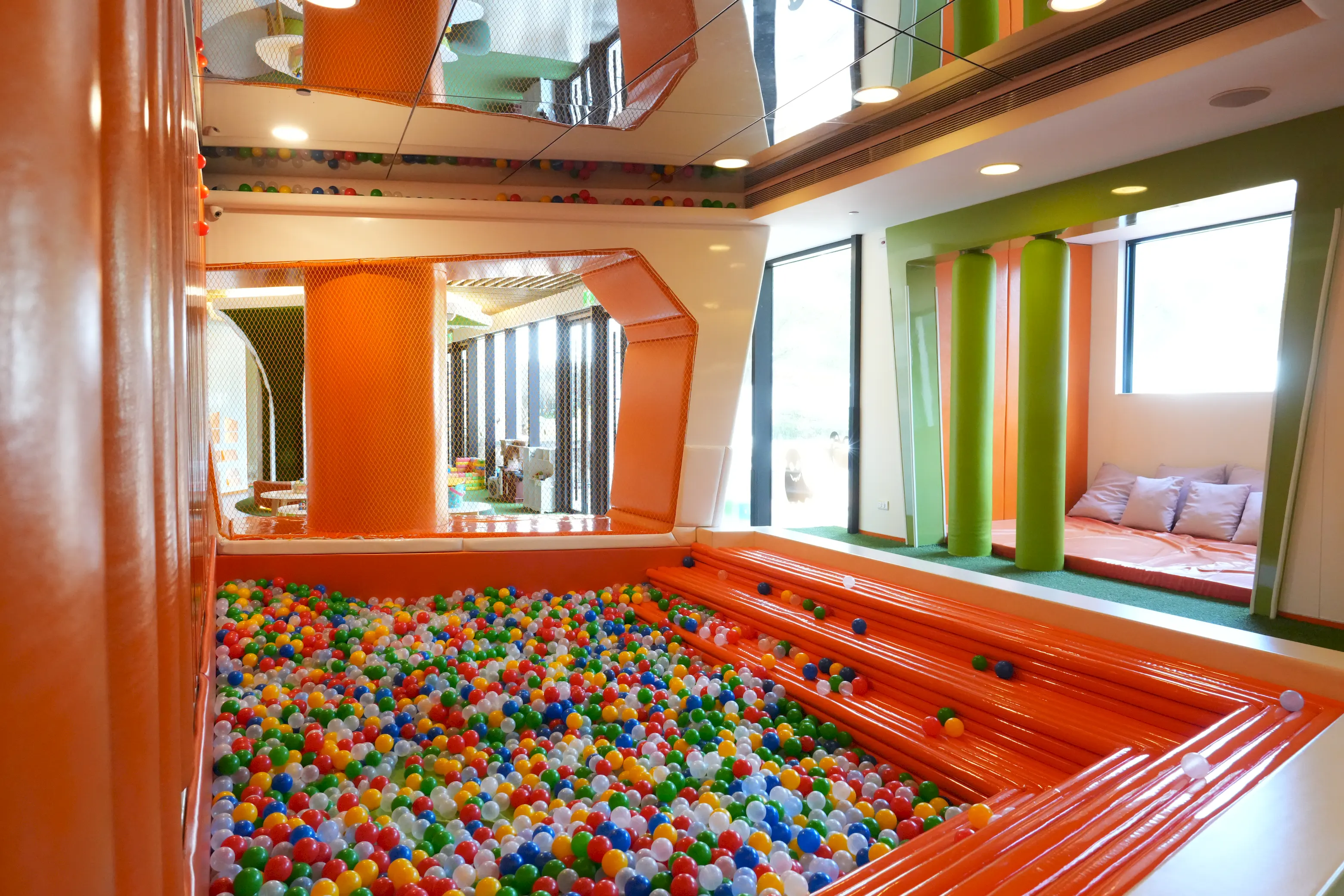 ▼而在樹屋的另一側,還有一座超受小朋友歡迎的大球池,空間很大且鋪有軟墊,孩子們可以在裡面盡情跳躍,非常適合家長帶小朋友來這裡放電。