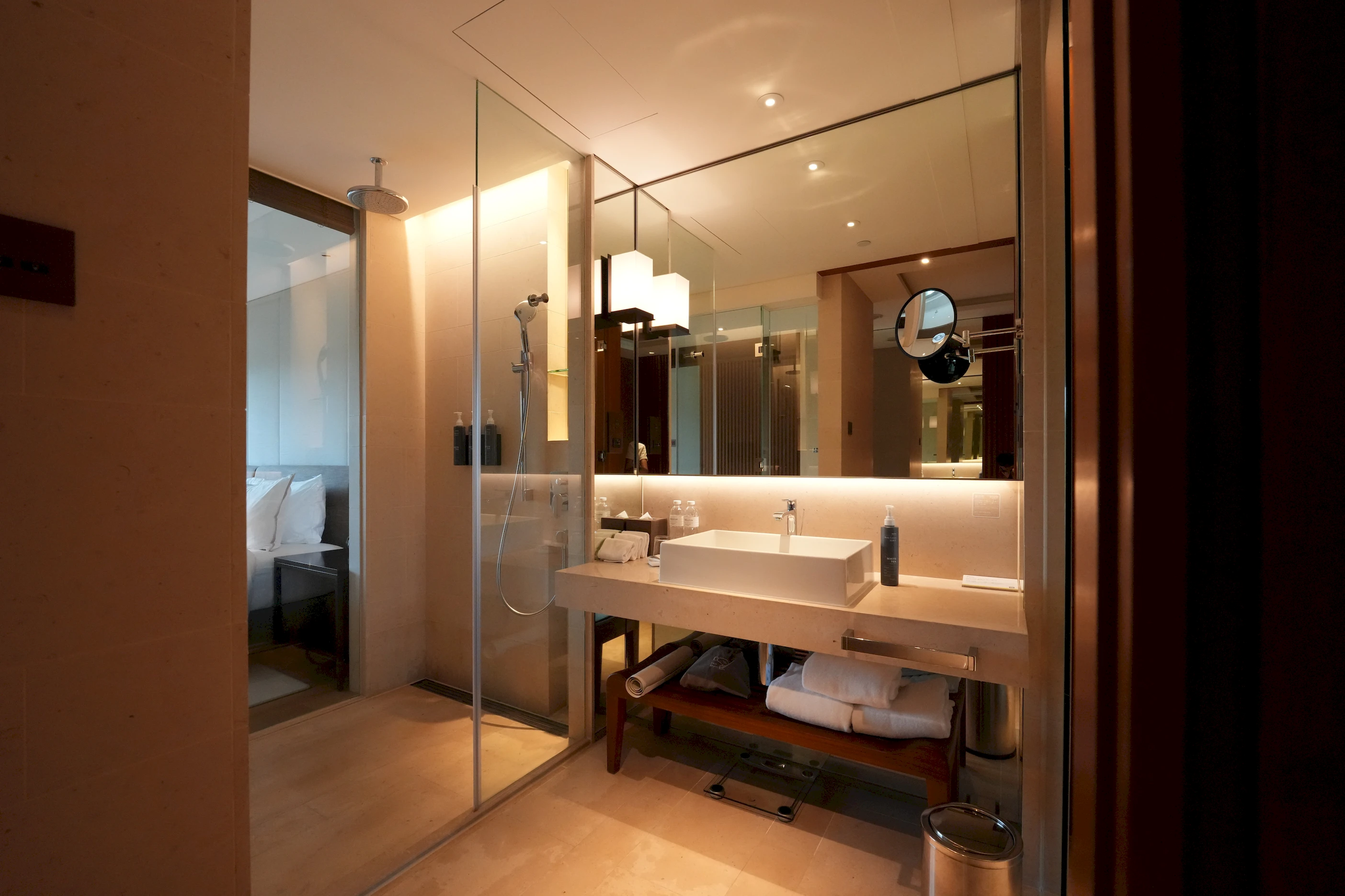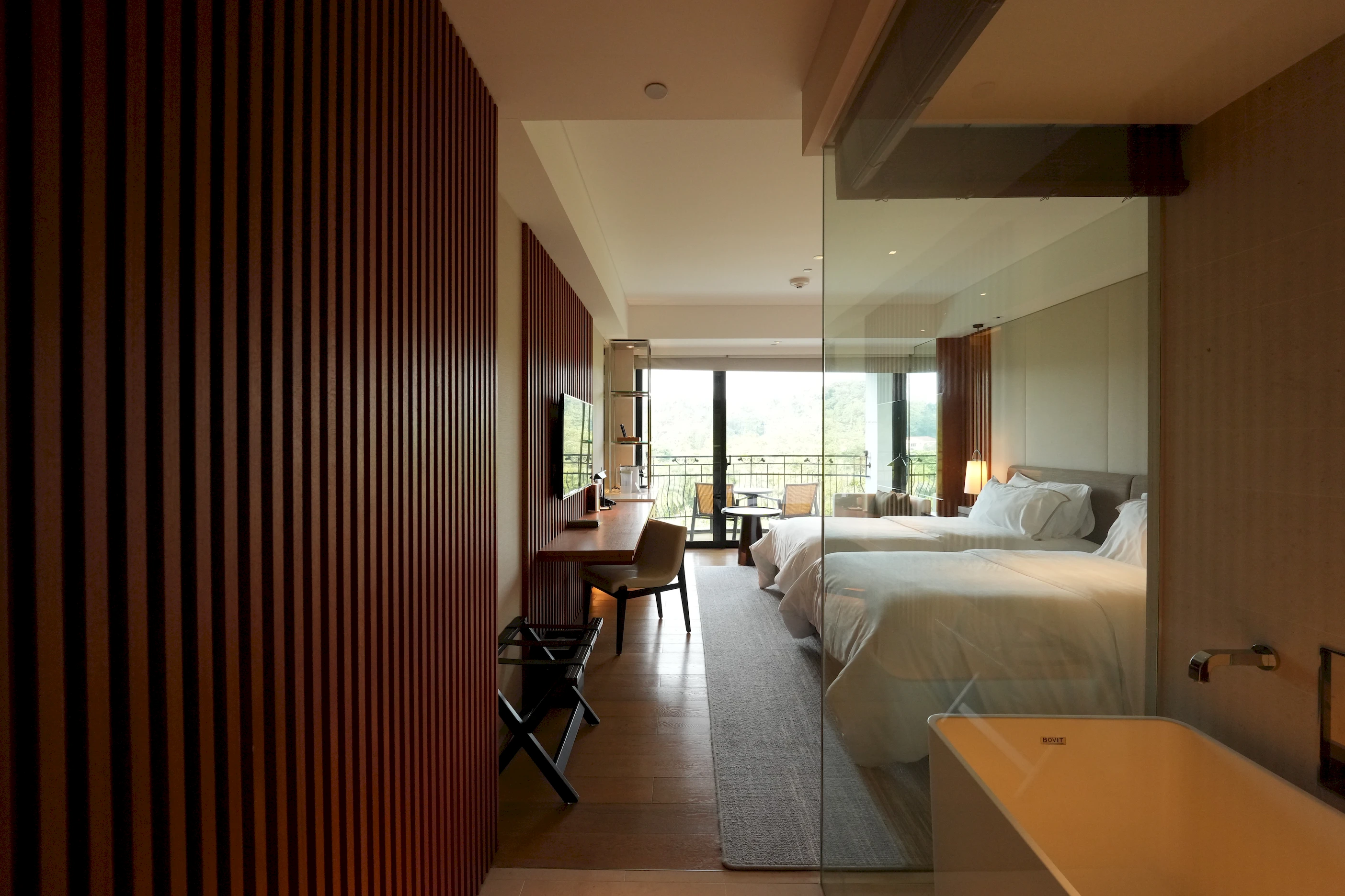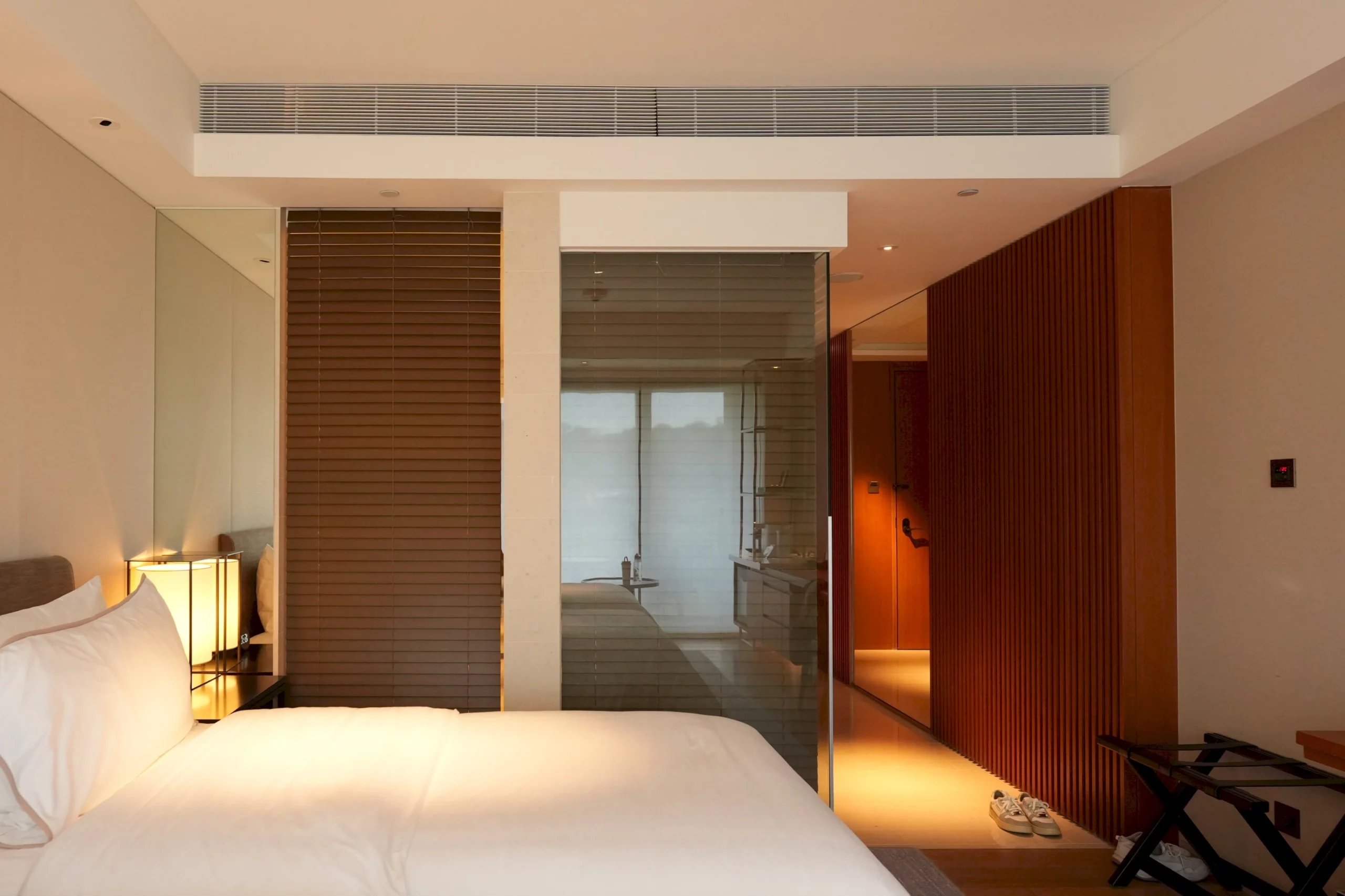 ▼房門一打開,映入眼簾的是暖黃燈光搭配木質板材的空間設計,氛圍格外放鬆,讓人一踏進來,旅途的疲憊感便自然而然地隨之卸下。