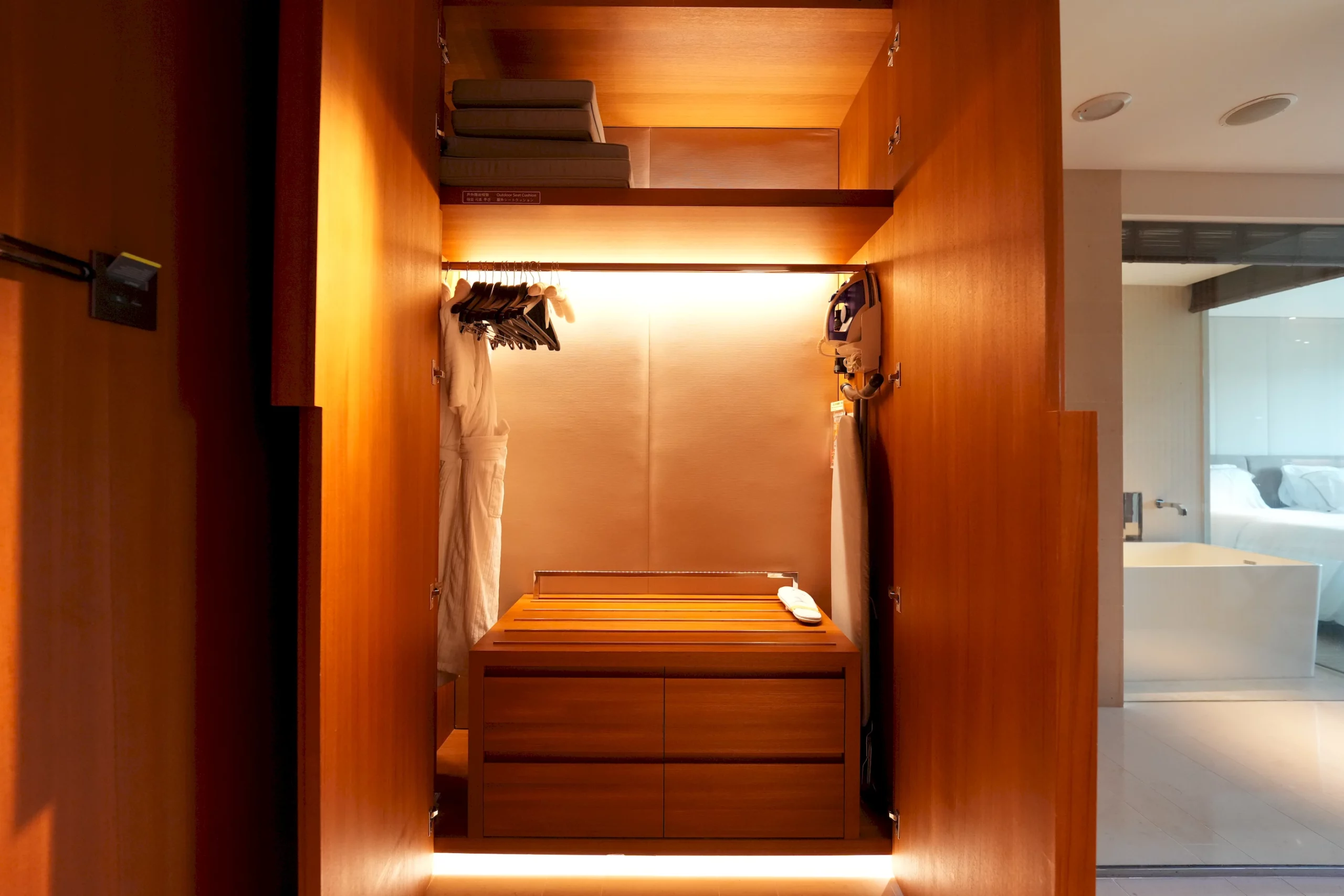 ▼衣櫃和全身鏡位於玄關左側,裡面備有室內拖、浴袍、熨斗、燙衣架及充足的衣架,其中室內拖厚實有份量,材質不同於外面常見的紙拖鞋,穿起來很舒適。