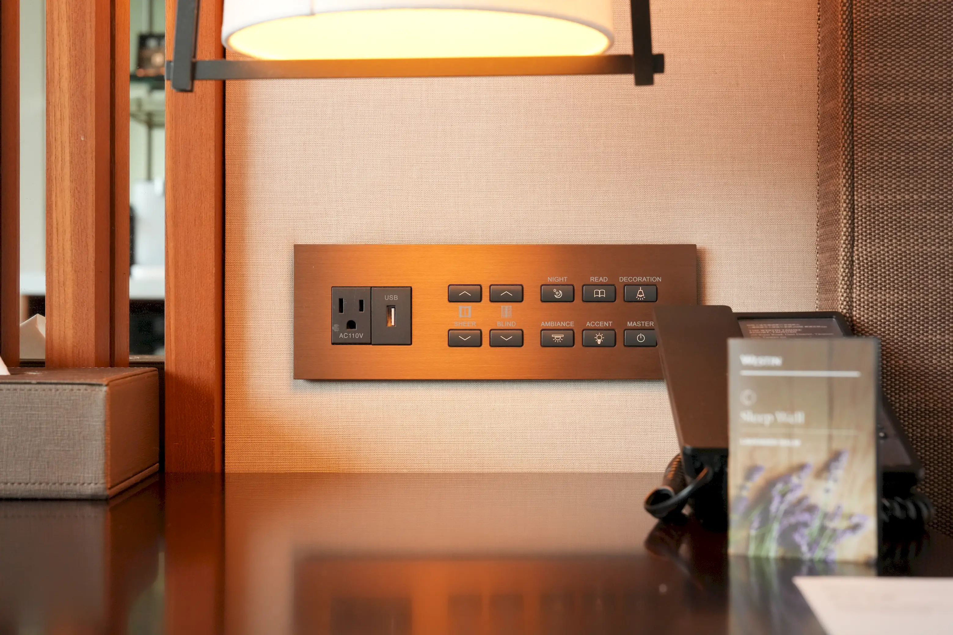 ▼左側床頭櫃的牆壁上設有房內的總開關,房客可以依照個人喜好,調整不同模式的室內燈光,以及控制陽台調光窗簾的開合。