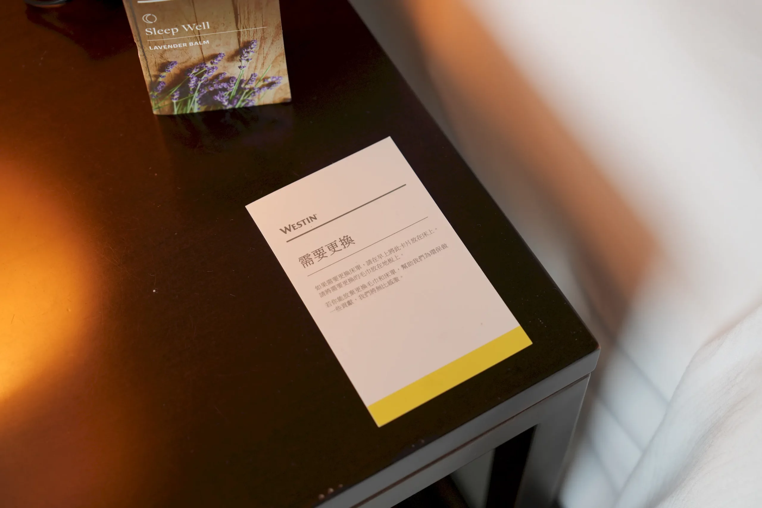 ▼另外,床頭櫃上還放置了薰衣草助眠精油,讓需要的房客在夜晚能更放鬆地入睡,而如果有續住,桌上有一張紙卡,房客只要將卡片放在床上,房務人員就會幫忙更換床單,讓人覺得特別貼心的是,即便我們沒有提出清潔需求,人員仍會主動整理,連朋友自帶的寢具也折疊得整整齊齊,服務真的非常周到。
