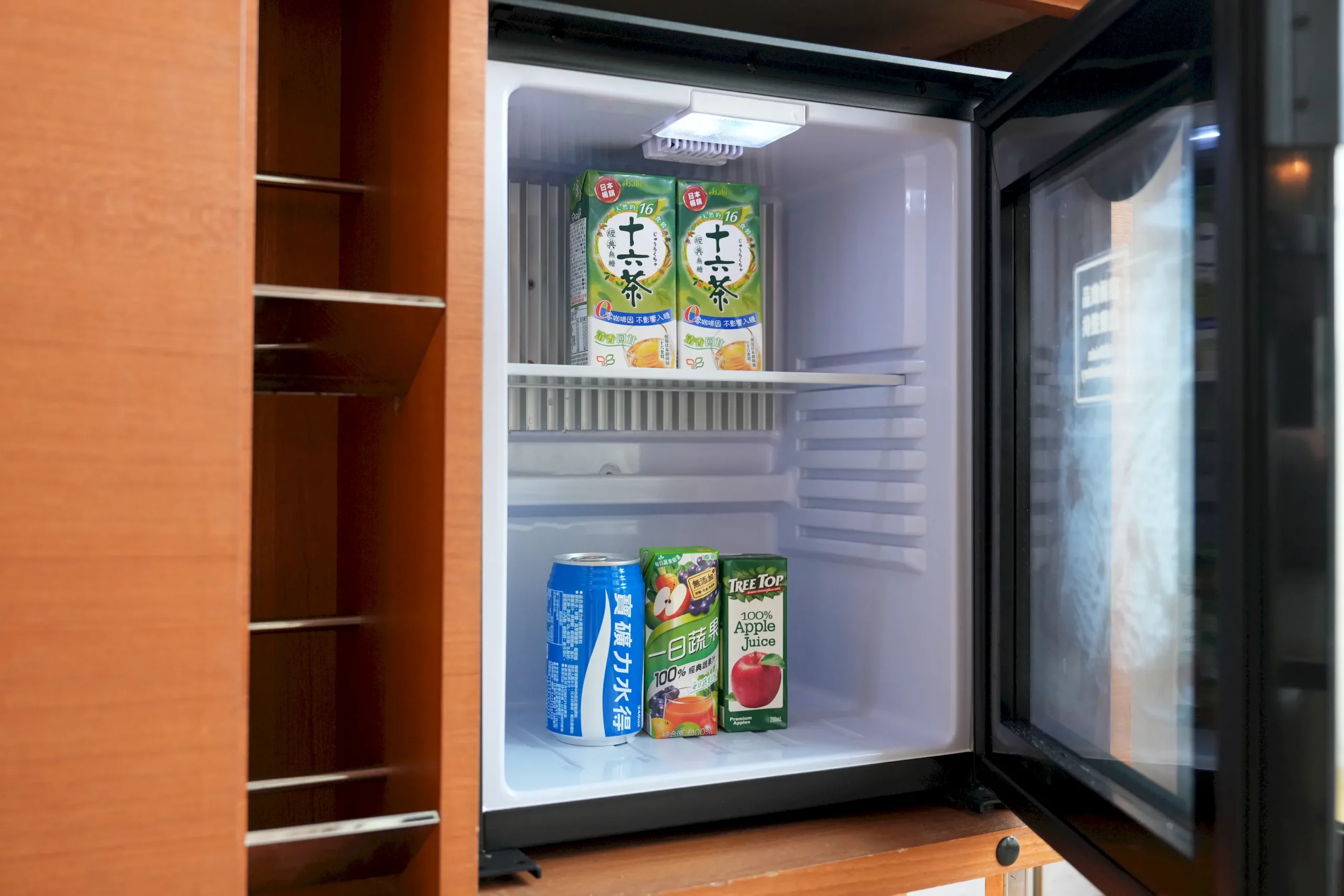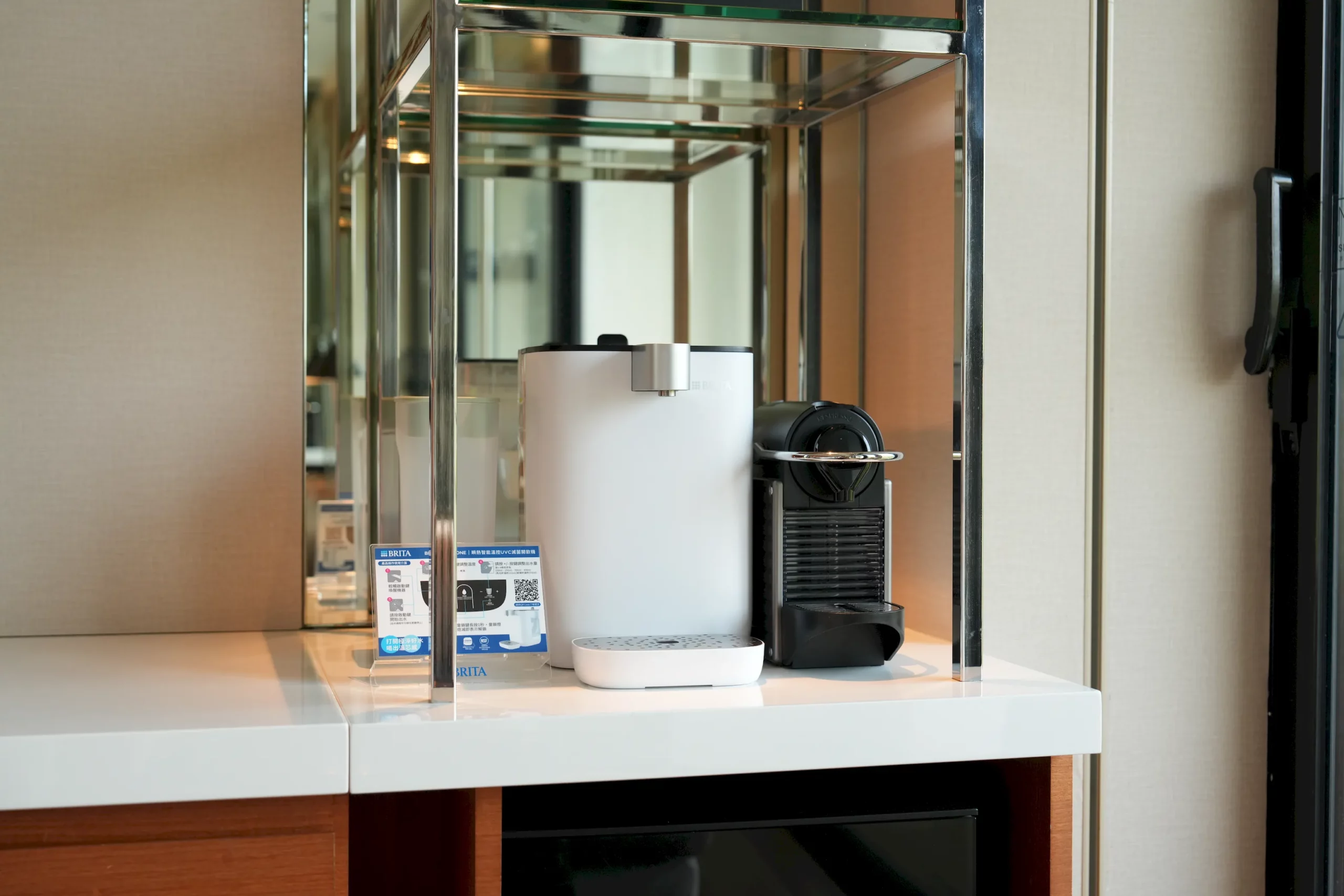 ▼Mini Bar位於電視櫃旁,上方有智能飲水機與膠囊咖啡機,下方則有小冰箱,內含樹頂蘋果汁、十六茶、寶礦力水得和蔬果汁等多款飲料,房客皆可免費取用。