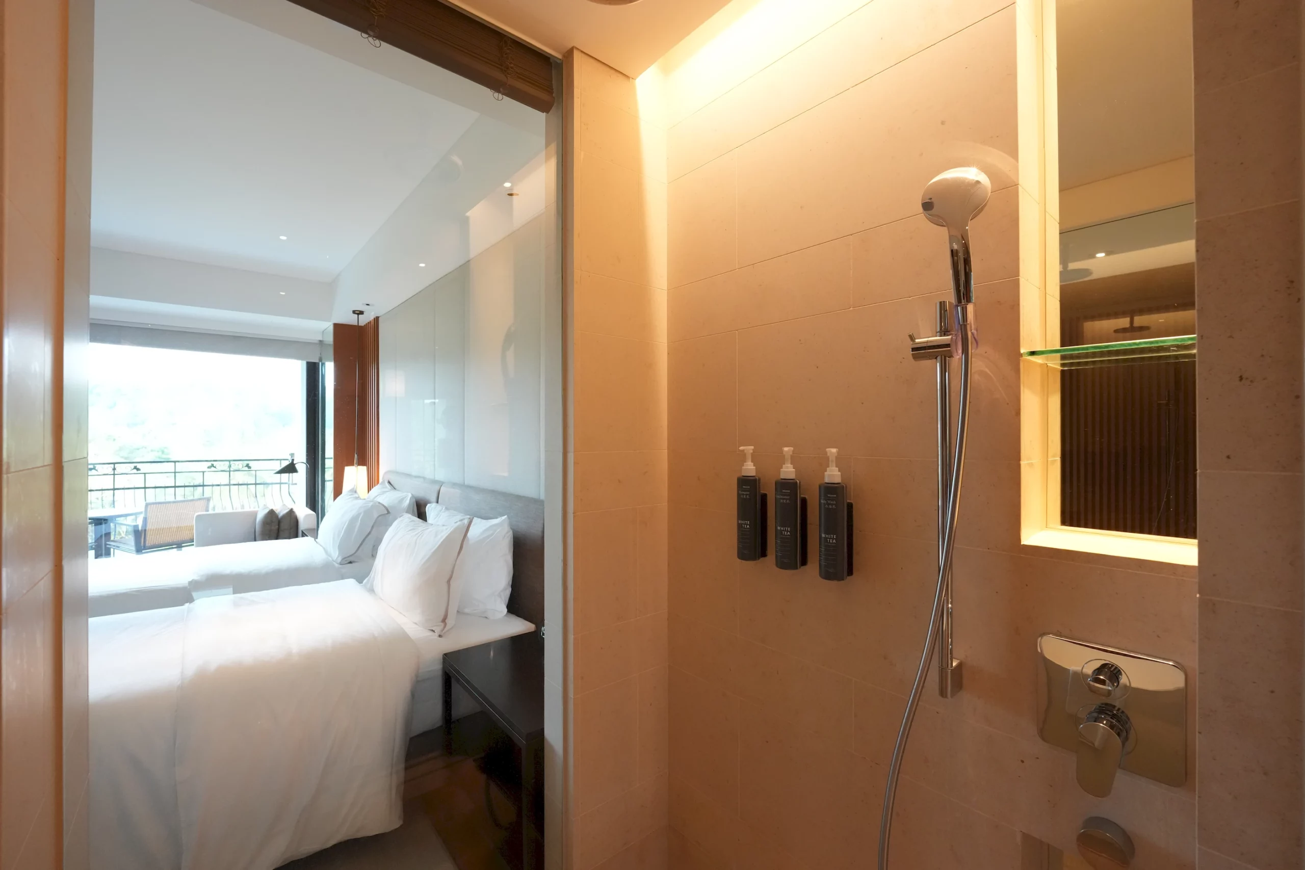 ▼淋浴間包含了乾濕分離的淋浴設備和單人浴缸,以及飯店指定的白茶蘆薈系列沐浴用品。