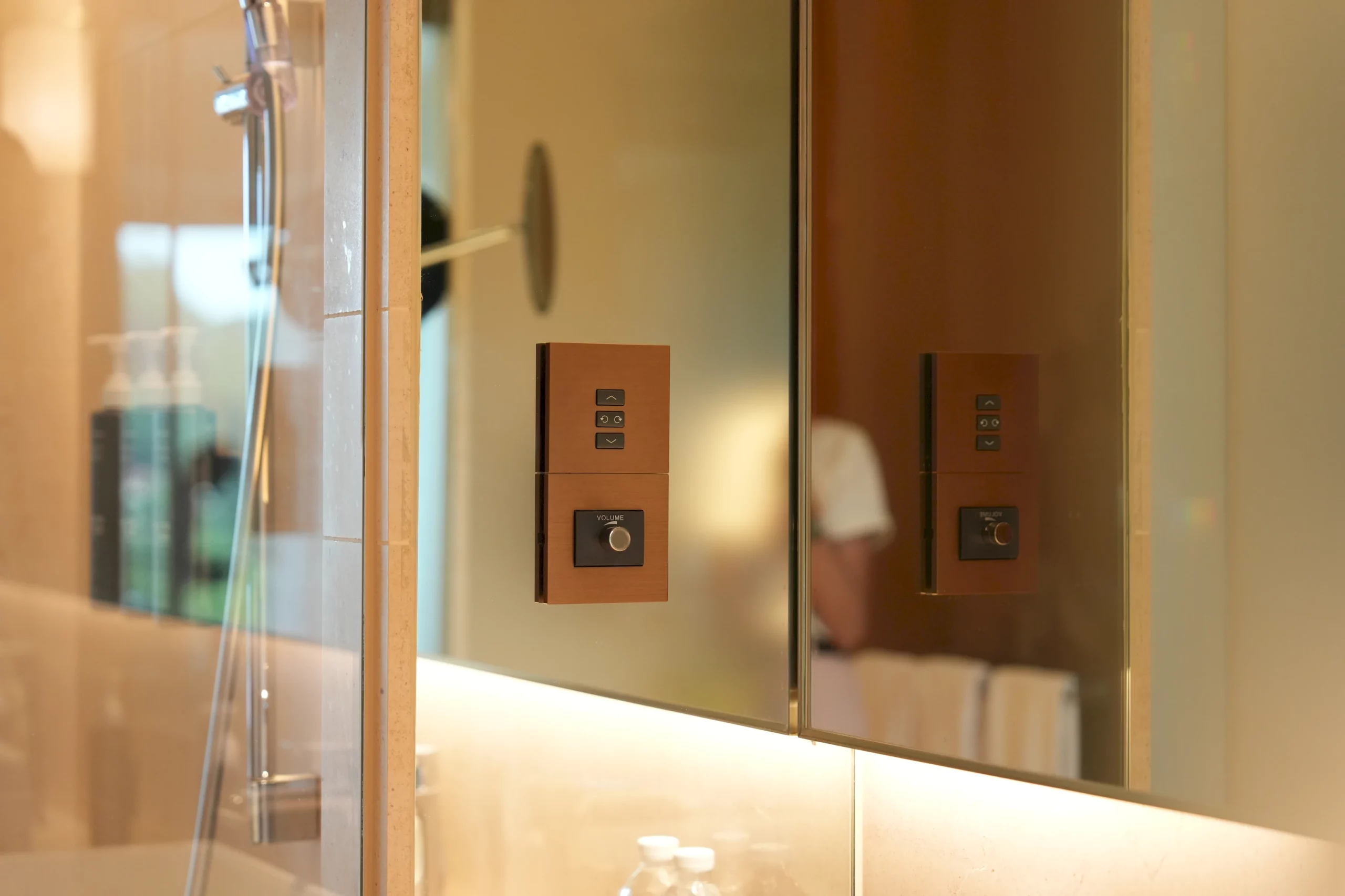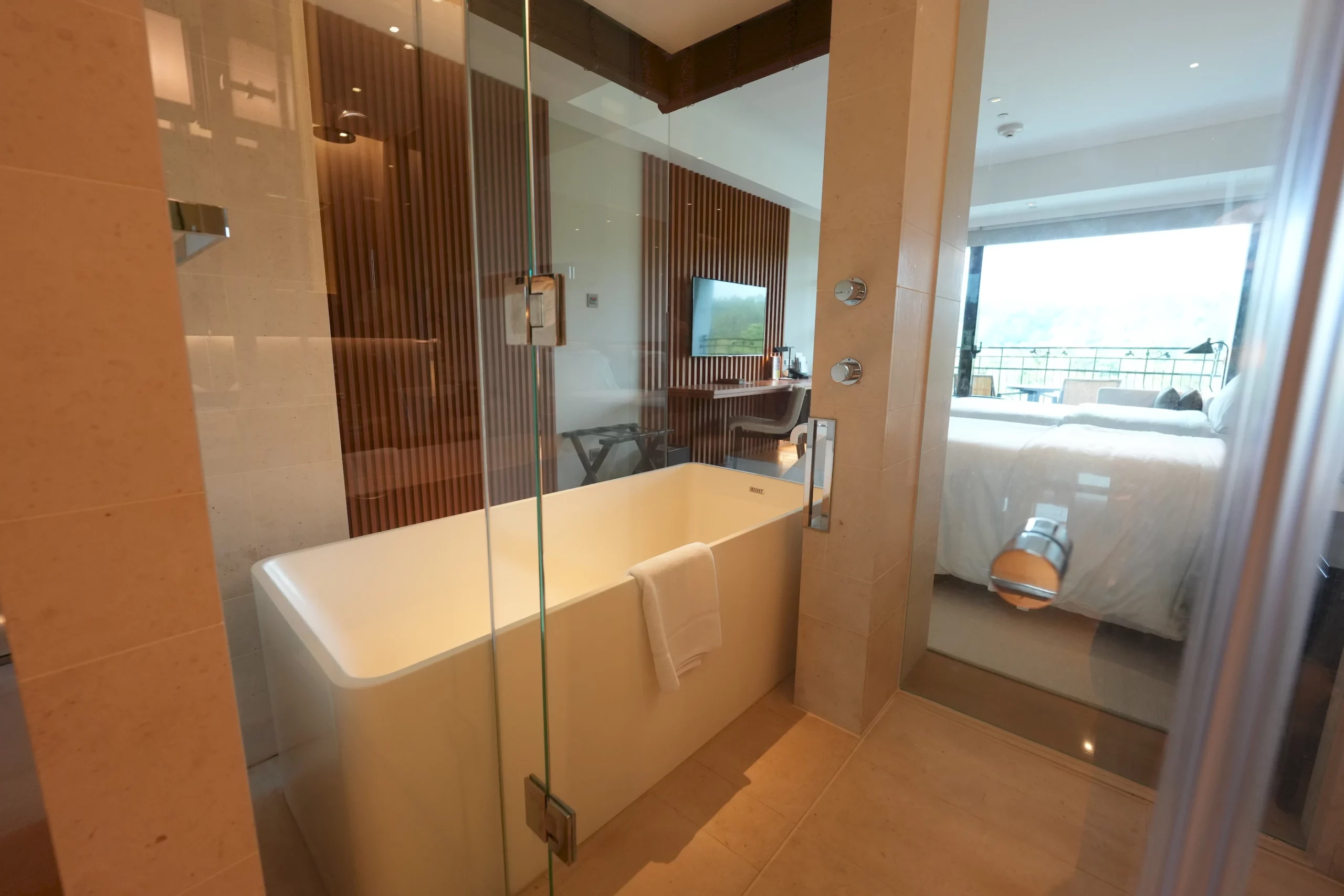 ▼至於浴簾,飯店採用的是電動木質百葉簾,使用時需要特別留意葉片的方向,如果調整的角度不正確,從外面看仍會一覽無遺。