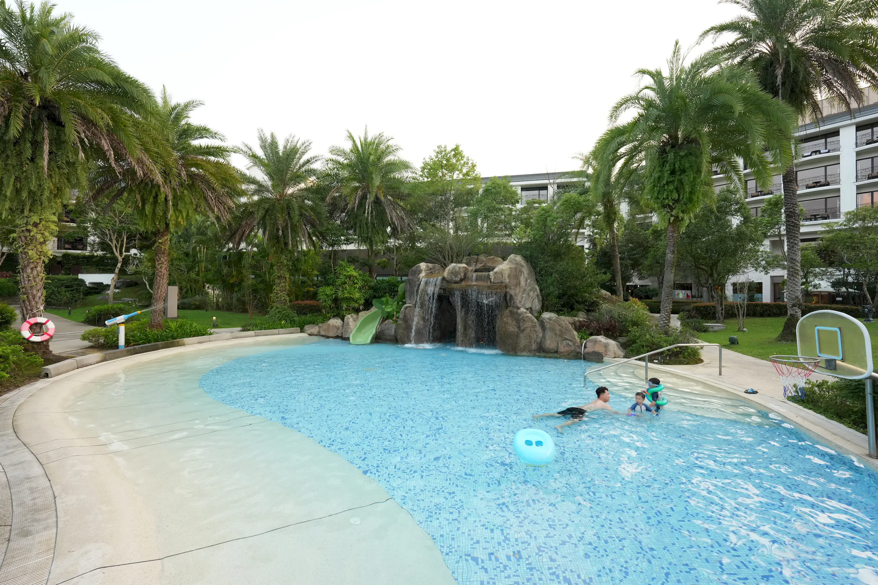 ▼「戶外泳池」腹地非常大,一旁有救生員,除了有漂亮的主池外,還有專為小朋友設計的兒童戲水區,戲水區水位較淺,並設有滑水道和水中籃球可以讓小朋友在裡面玩上一整個下午,池畔則有充滿巴里島風情的涼亭,非常適合在這裡拍拍美照,或躺在躺椅上享受日光浴。