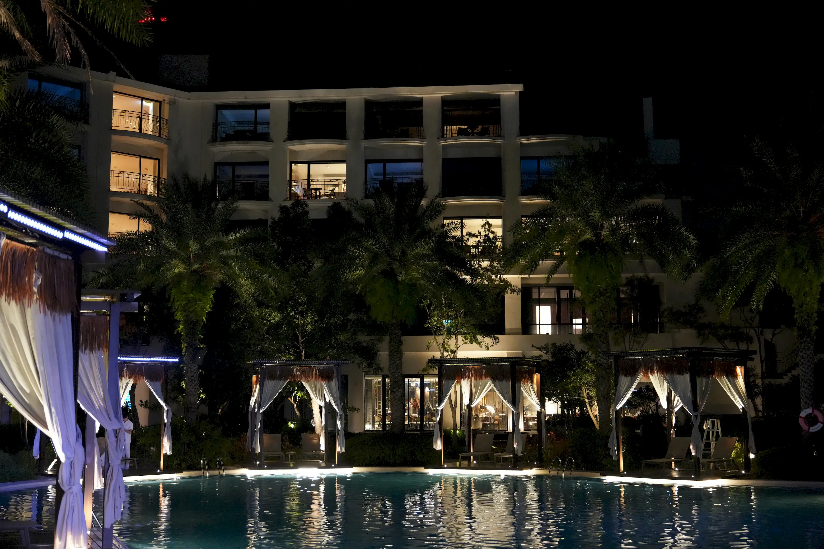 ▼到了晚上,柔和的燈光映照在水面上,微微泛起波光,房客可以在池中悠游,或倚靠在躺椅上欣賞夜色,靜靜享受悠閒的度假氛圍。